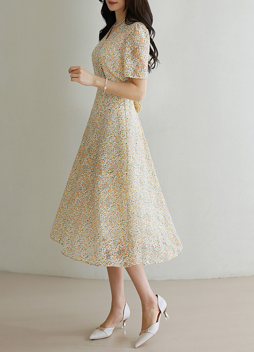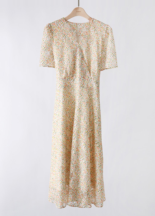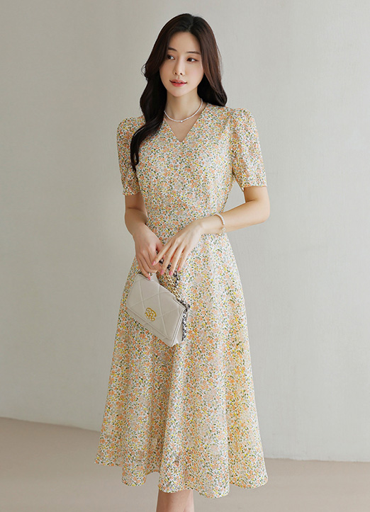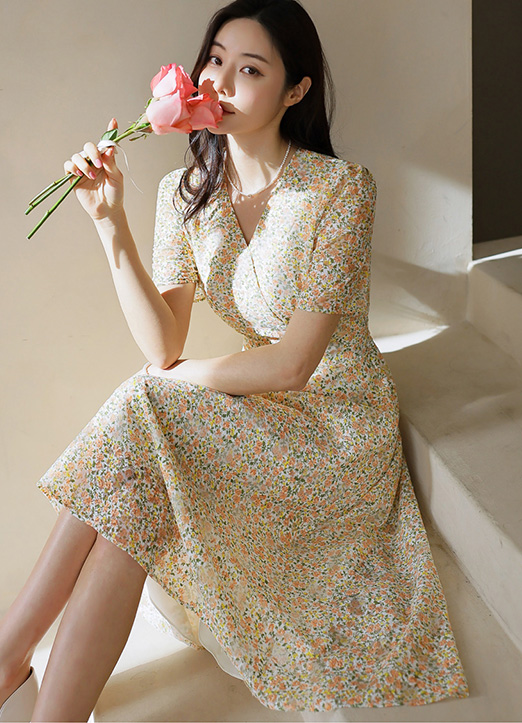 [LouisAngel] 러블리 플라워 랩 브이넥 퍼프 플레어 원피스
