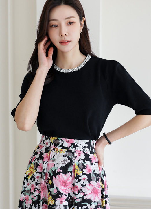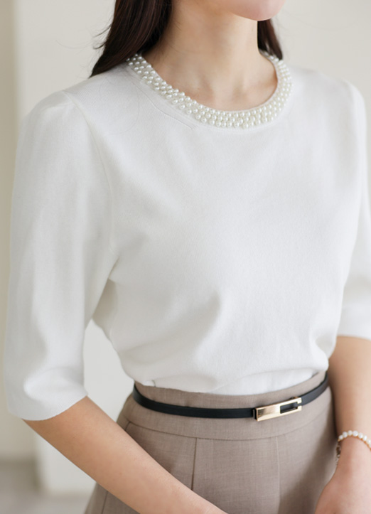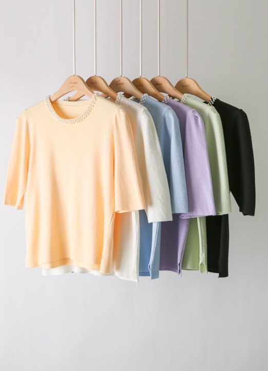 [ Theonme ] 비스코스 진주넥장식 퍼프소매 반팔 니트_6color