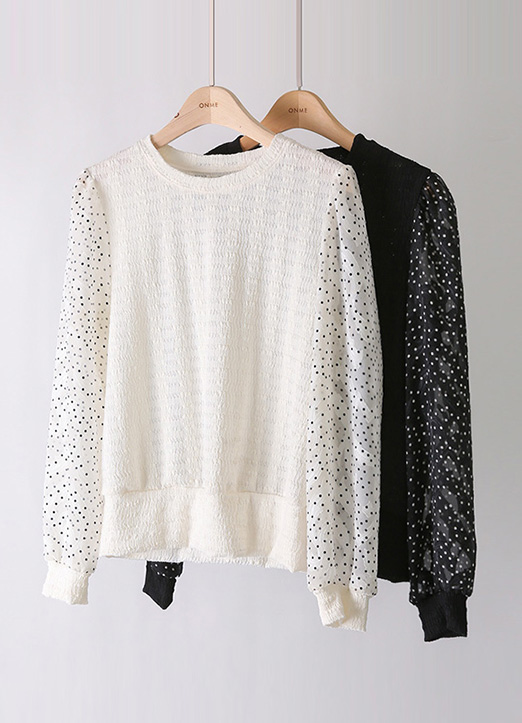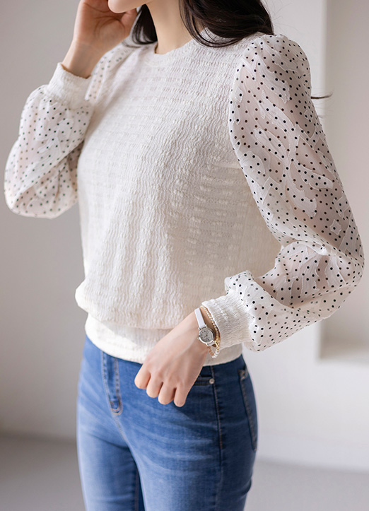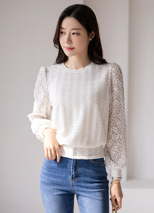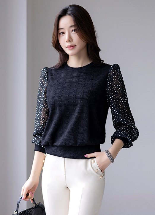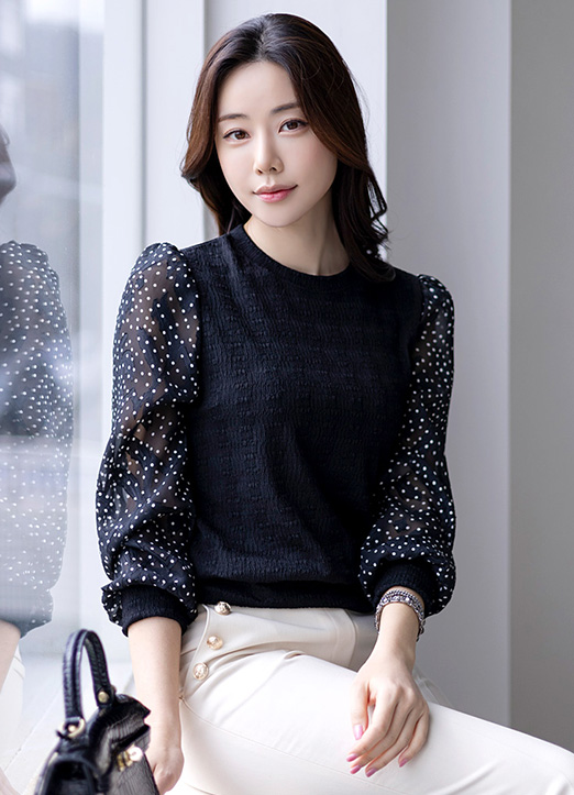 쟈가드와 도트 패턴의 조화가 돋보이는 쉬폰 소매 배색디자인으로