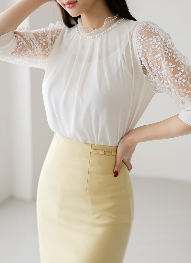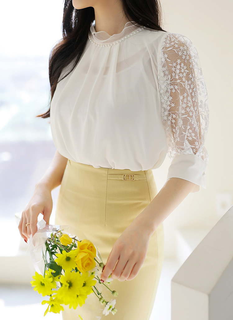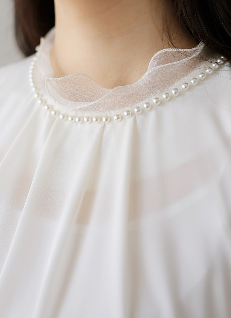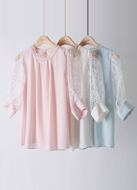리켄 플라워 자수 레이스 퍼프소매 진주넥 블라우스