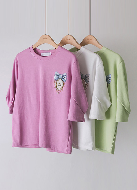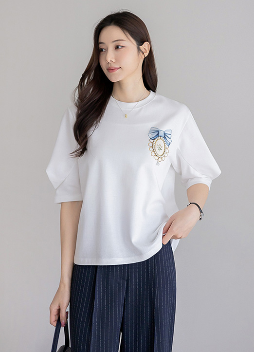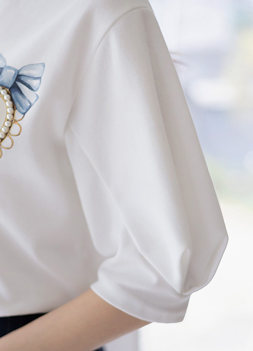 블레인 진주 브로치 프린팅 핀턱 소매 티셔츠