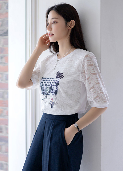 시스루 레이스 5부 소매로 여리여리한 실루엣을 연출해주며,