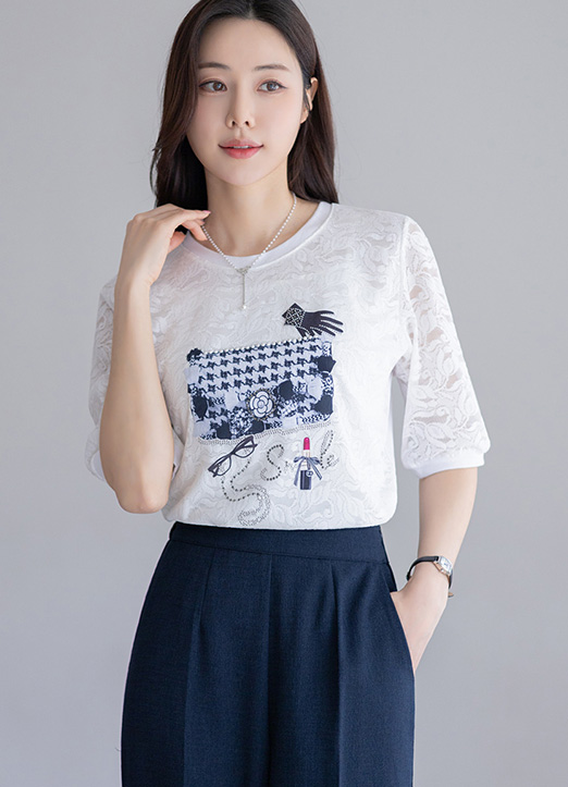 로벨 레이스 레이어드 트위드 프린팅 핫픽스 블라우스 티