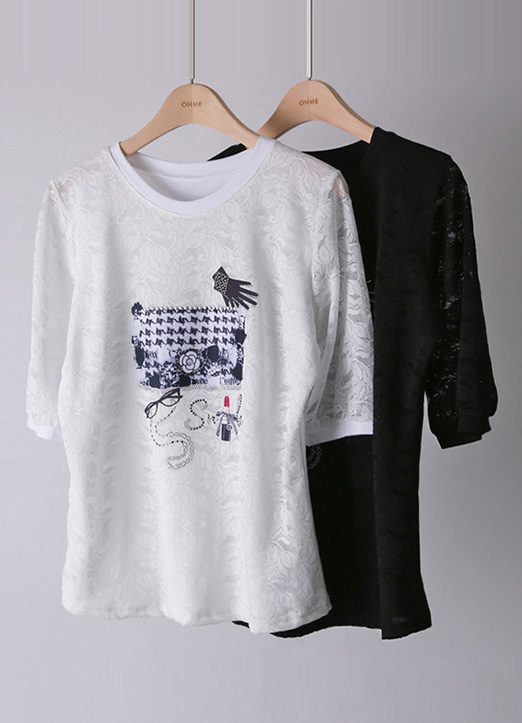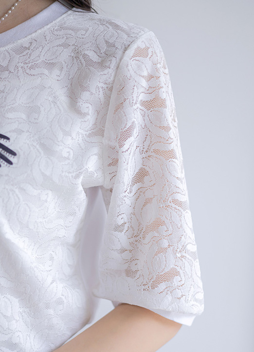 코튼 티셔츠에 레이스 원단이 레이어드되어