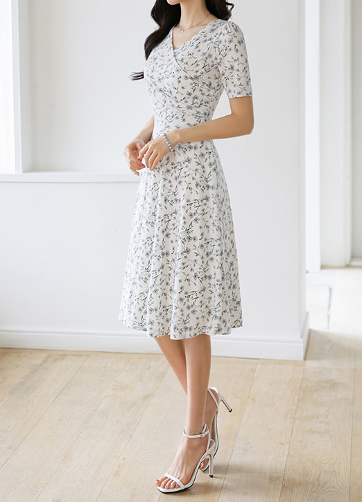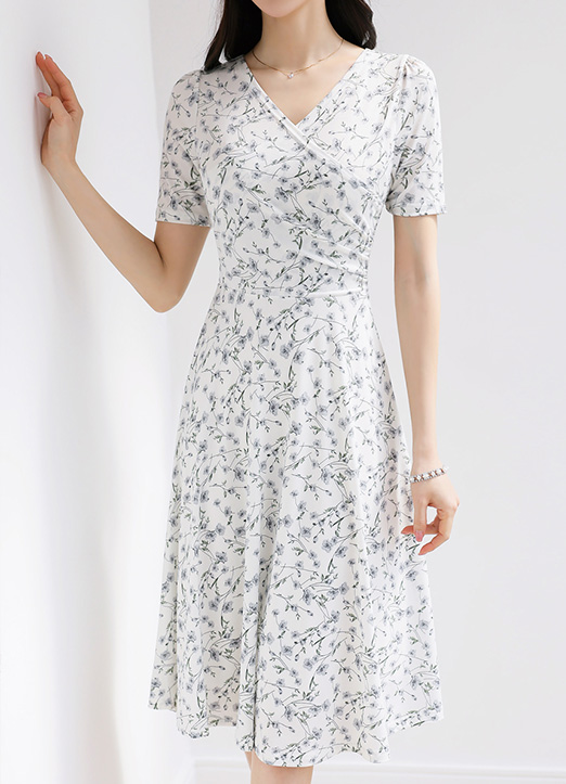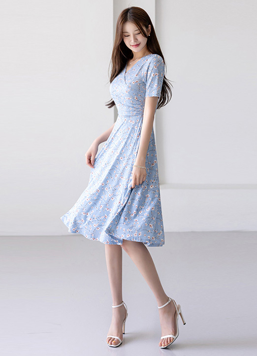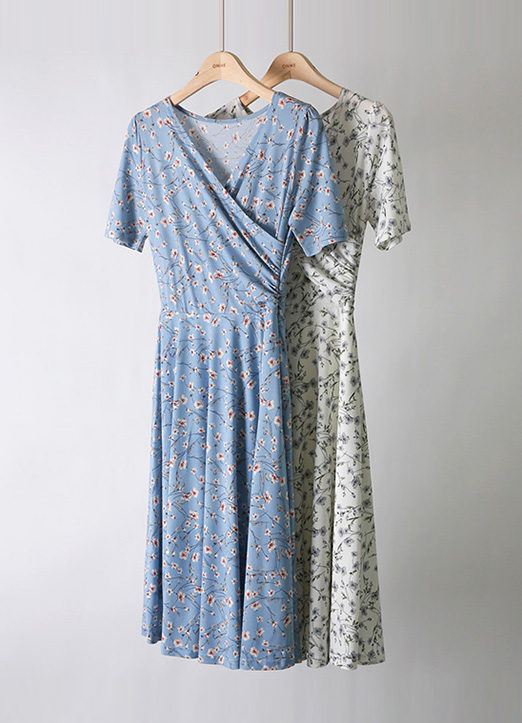 [LouisAngel] 베니플라워 실키 텐션 셔링 랩 디자인 A라인 플레어 원피스