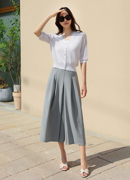 스커트처럼 디자인된 치마 바지로 페미닌한 무드를 선사하며