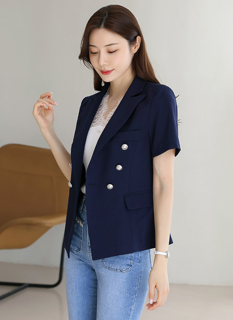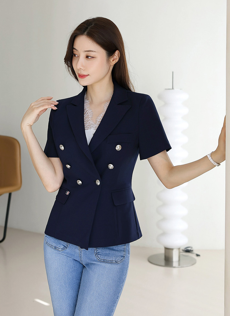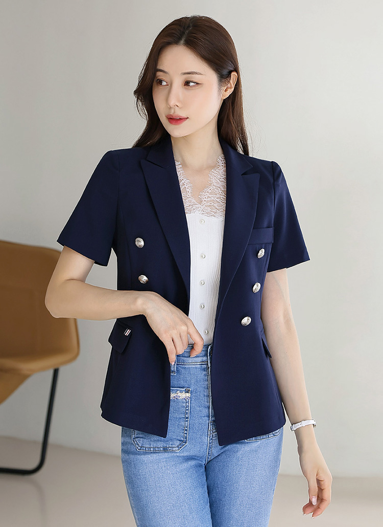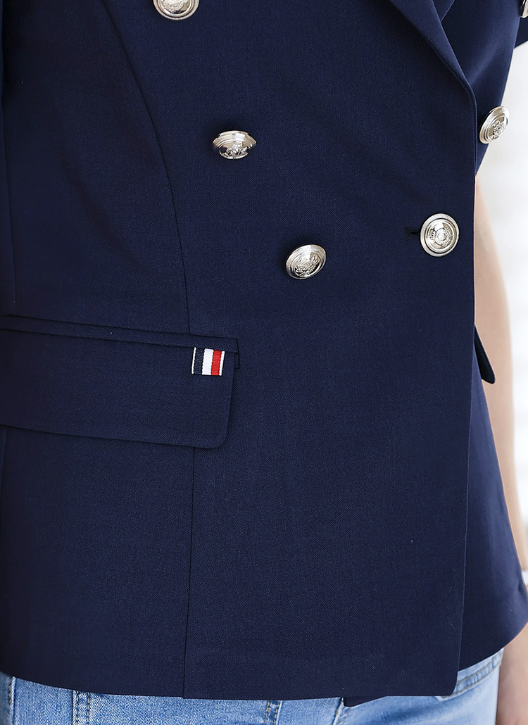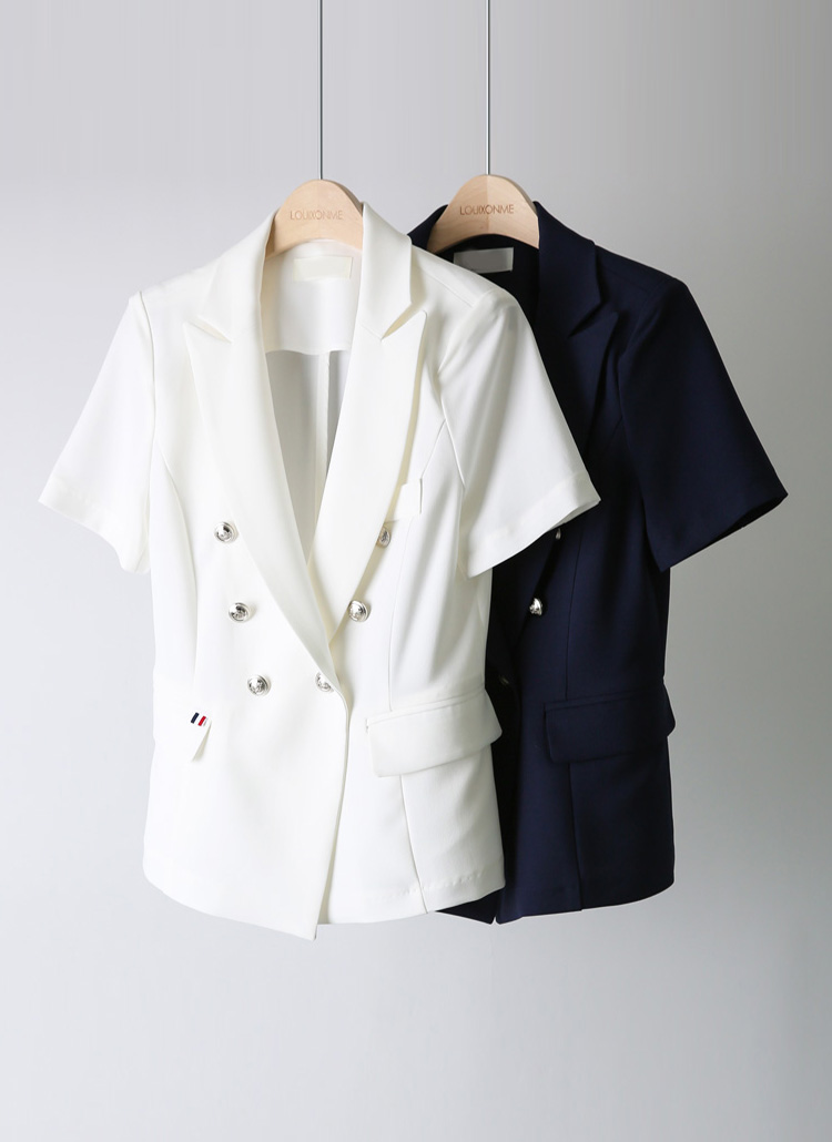 렌티 배색 테잎 더블 버튼 페미닌라인 반팔 자켓