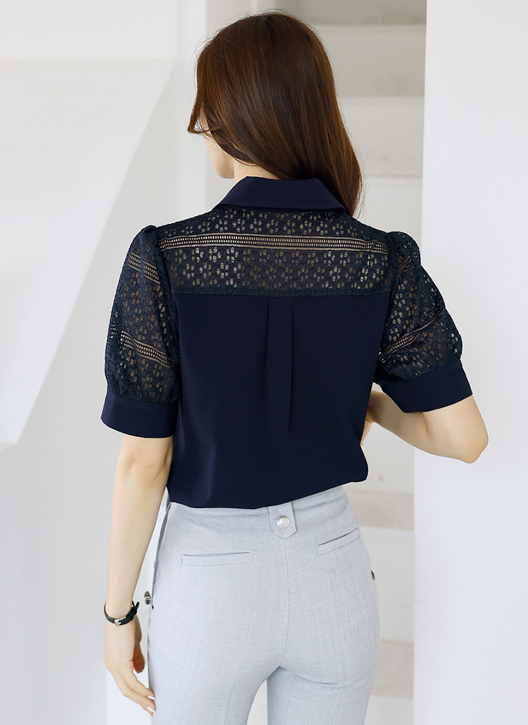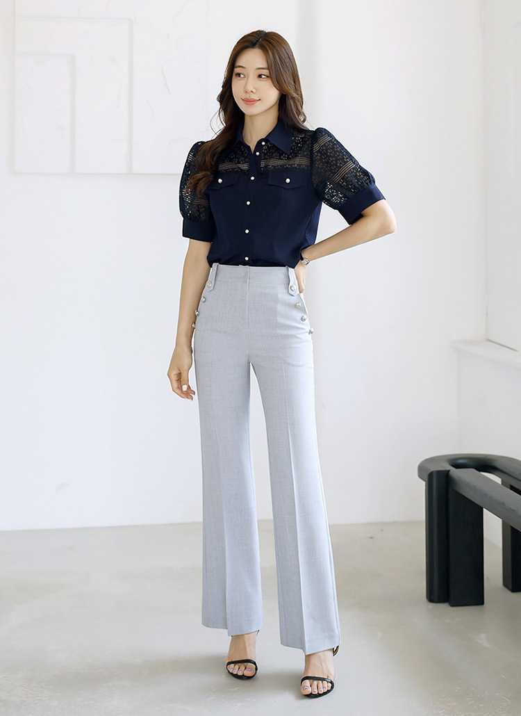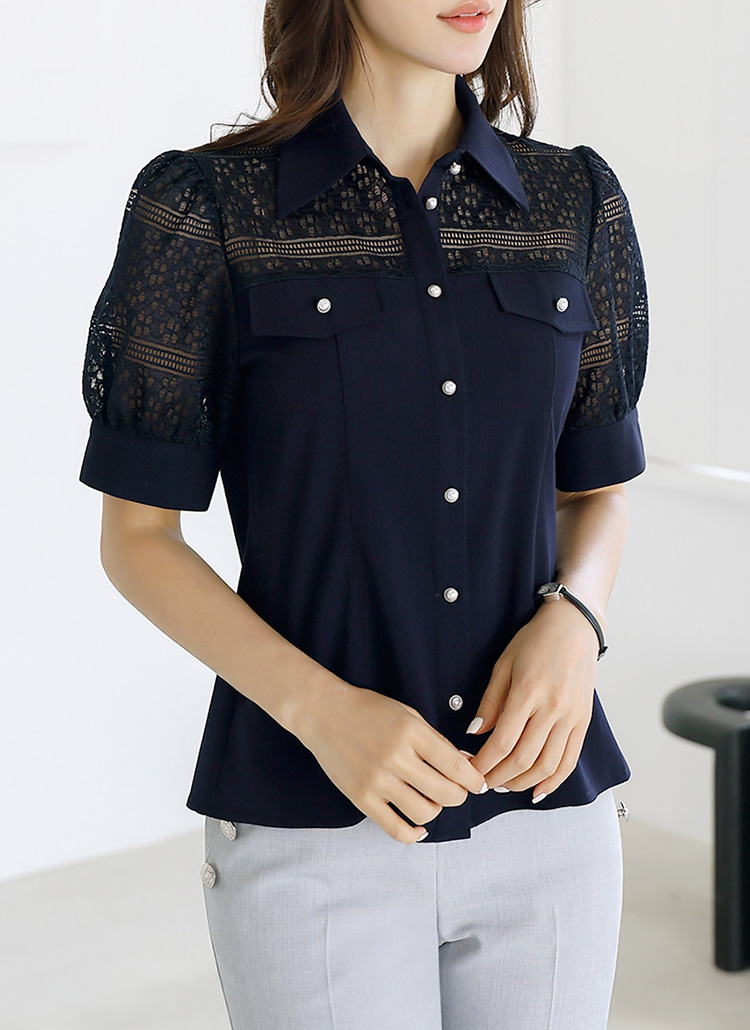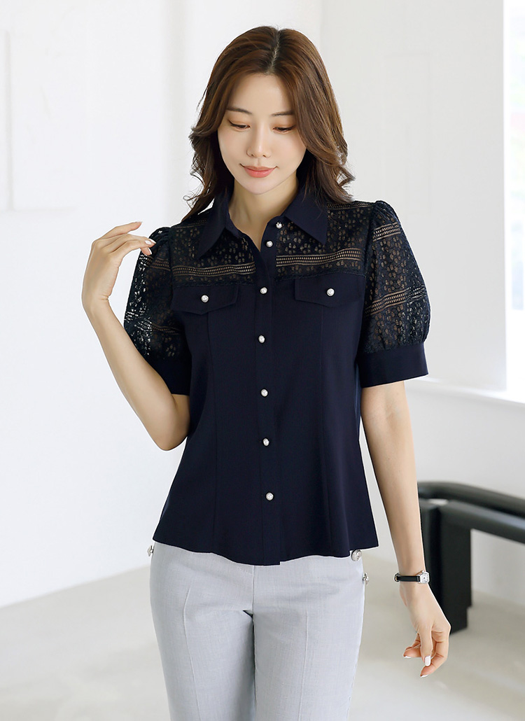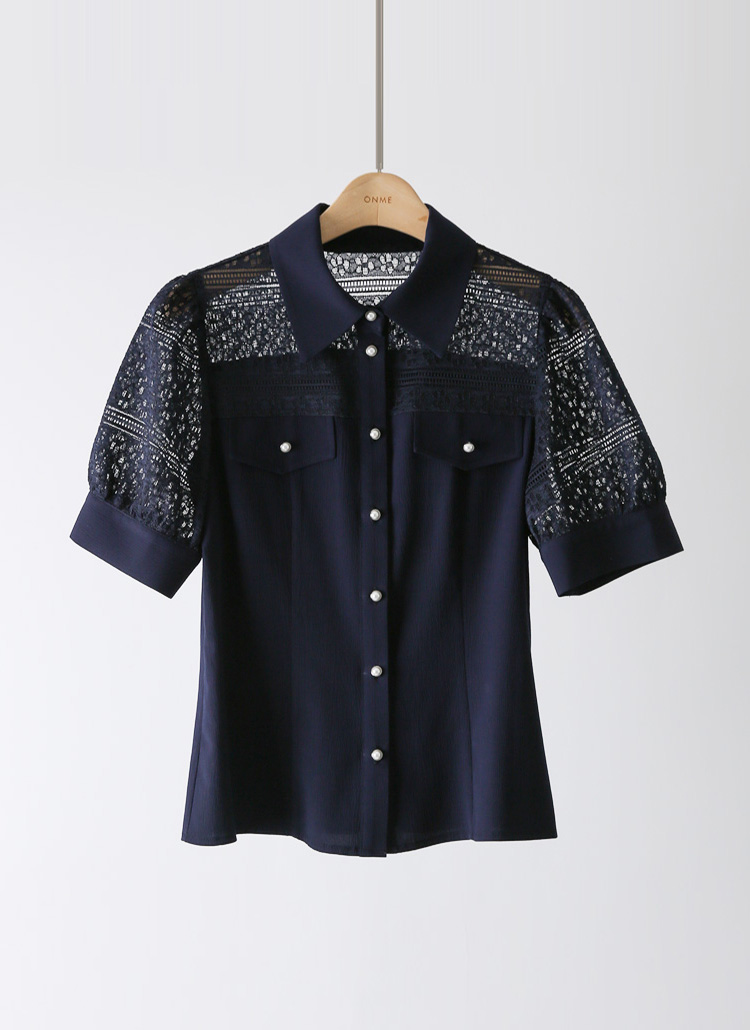 [LouisAngel] 리올리 진주버튼 뱀부 블렌딩 펀칭 레이스 배색 셔츠 블라우스