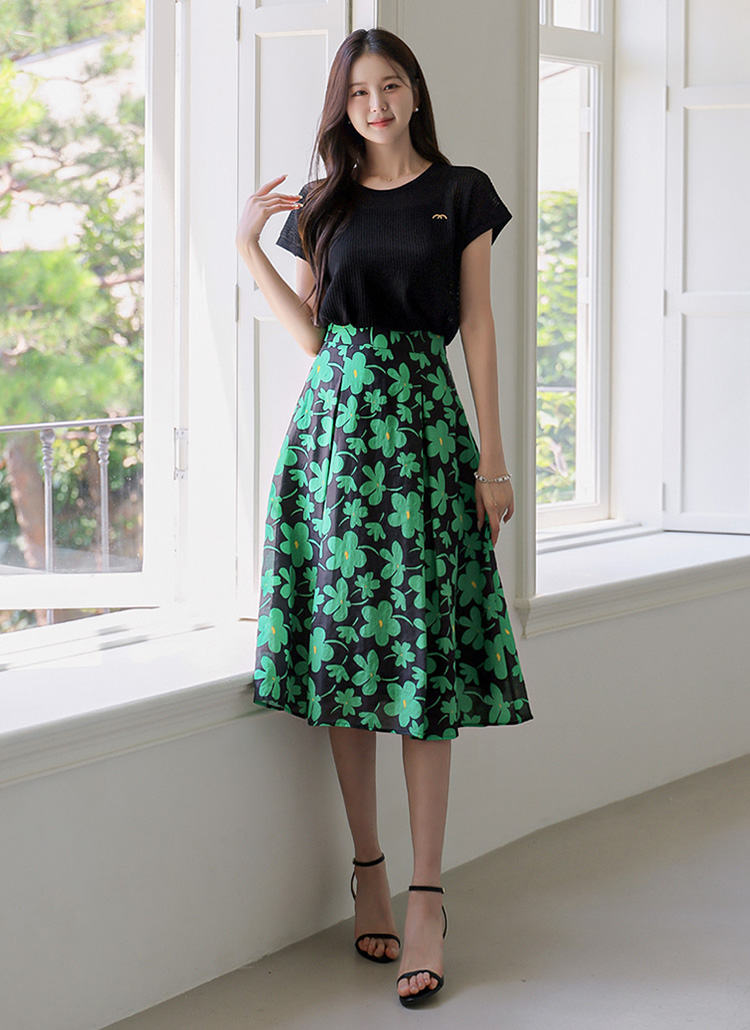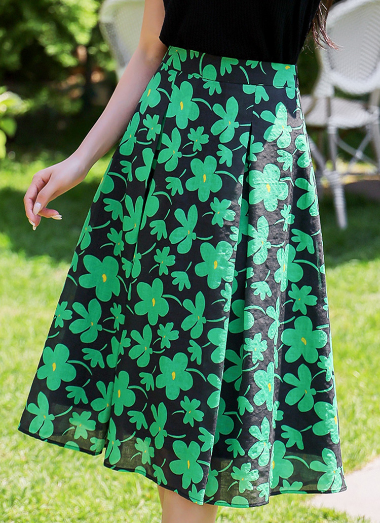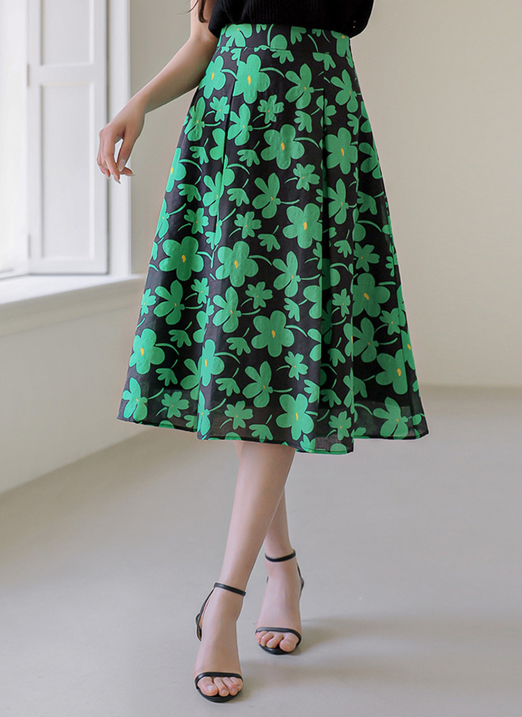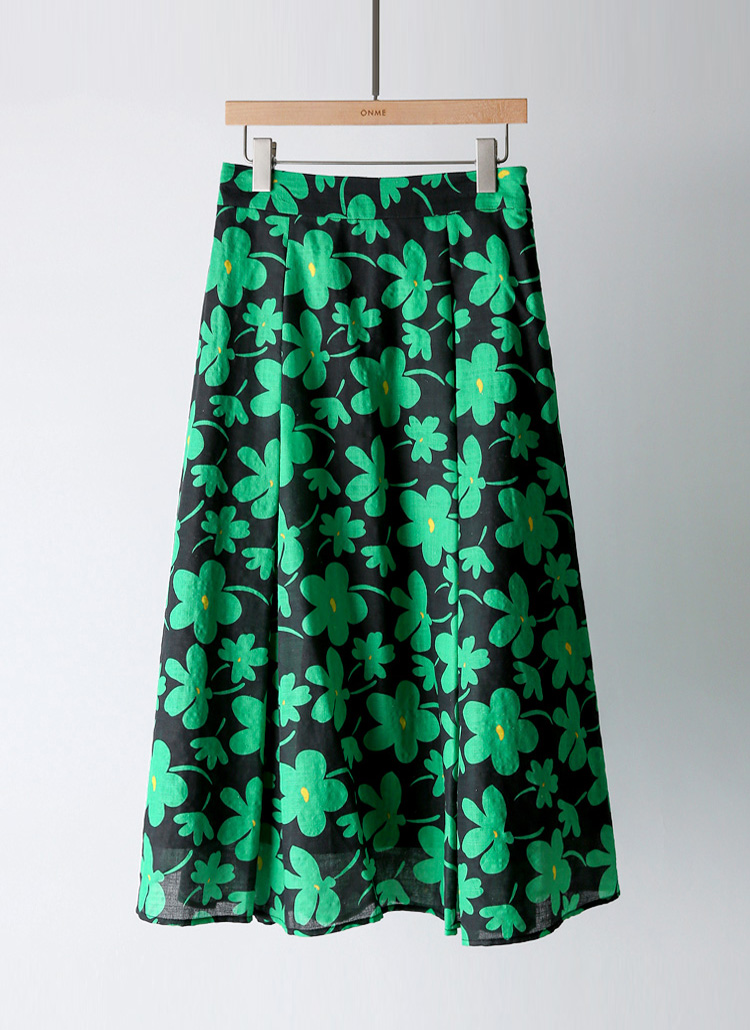 [LouisAngel] 싱그러운 매력 그린 플라워 핀턱 플리츠 A라인 스커트