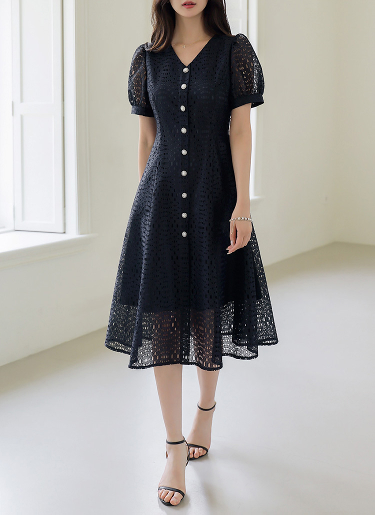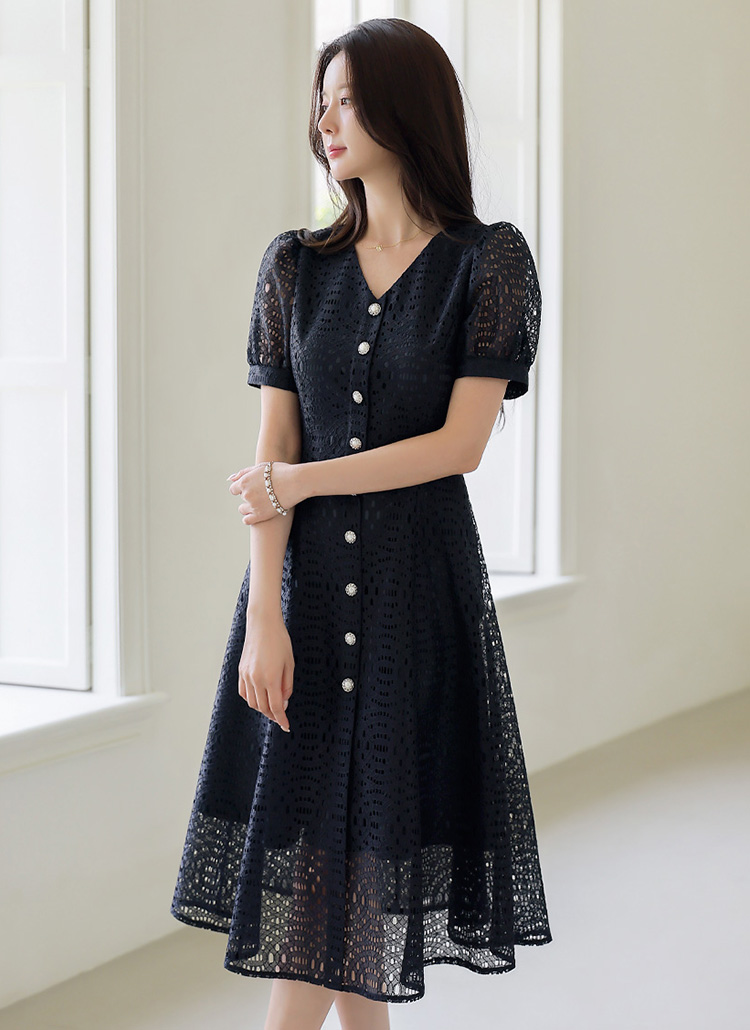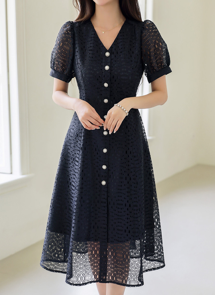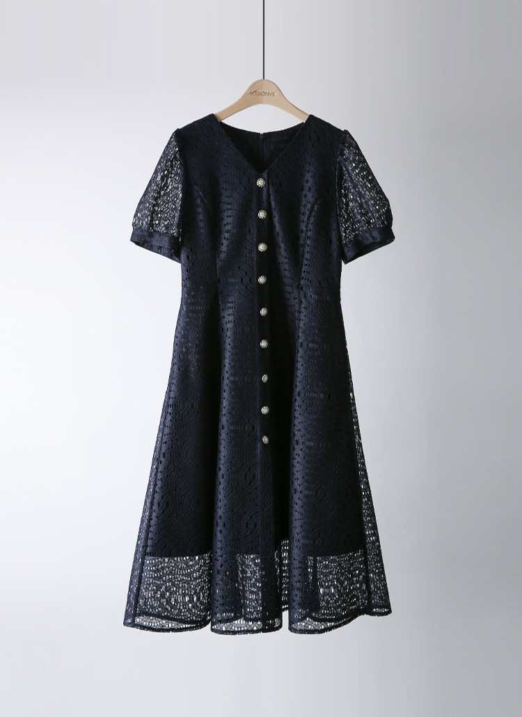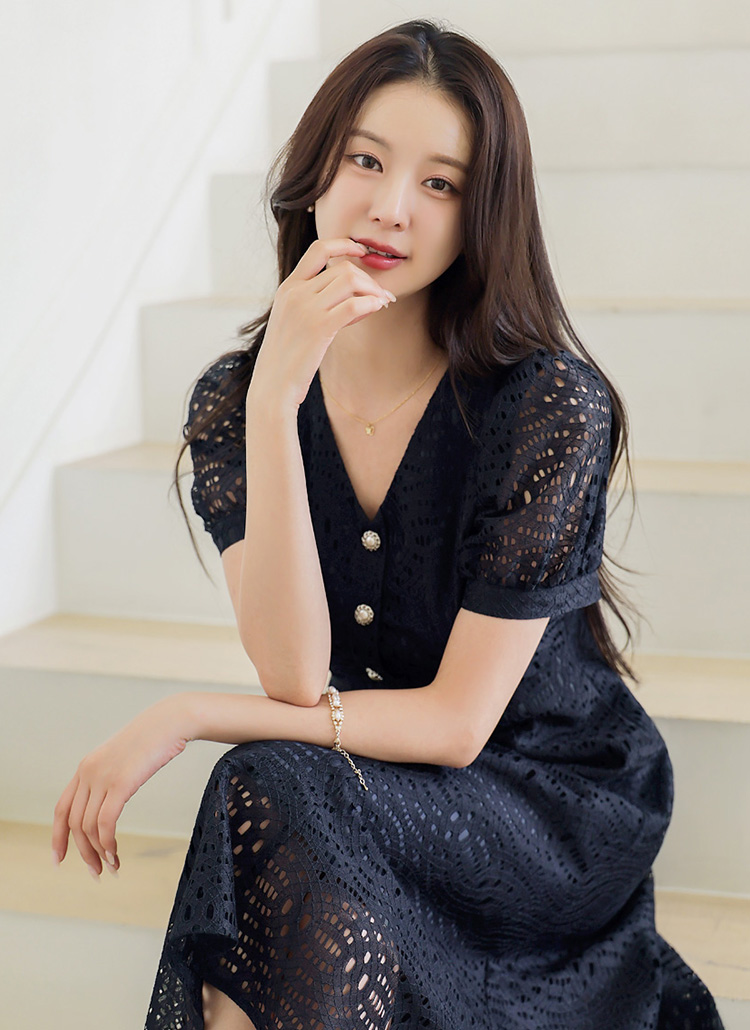 [LouisAngel] 에디안 진주 버튼 모티브 펀칭 레이스 A라인 플레어 원피스