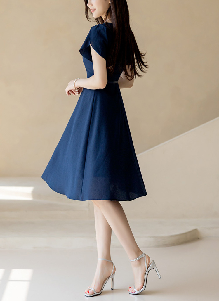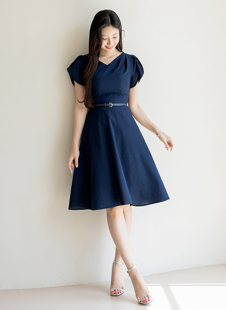 청초한 튤립 소매 벨트SET 핀턱브이넥 플레어 원피스