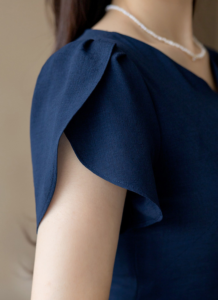 튤립 소매와 핀턱 랩 브이넥이 만나 로맨틱한 무드를 연출하는