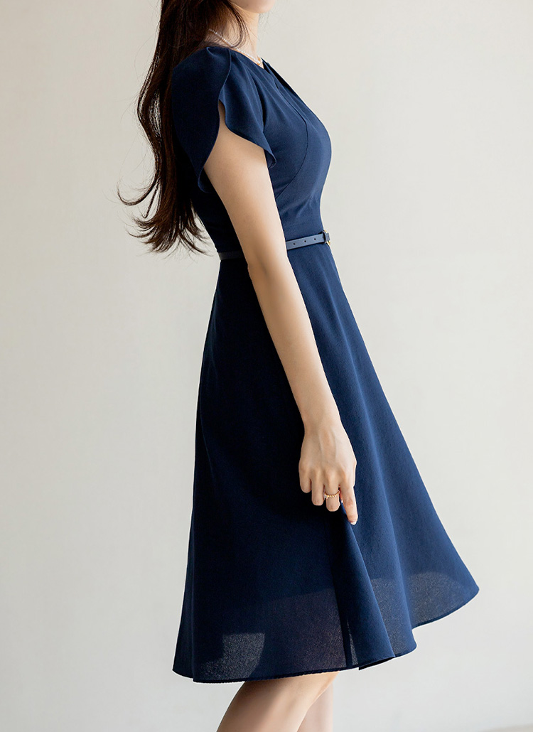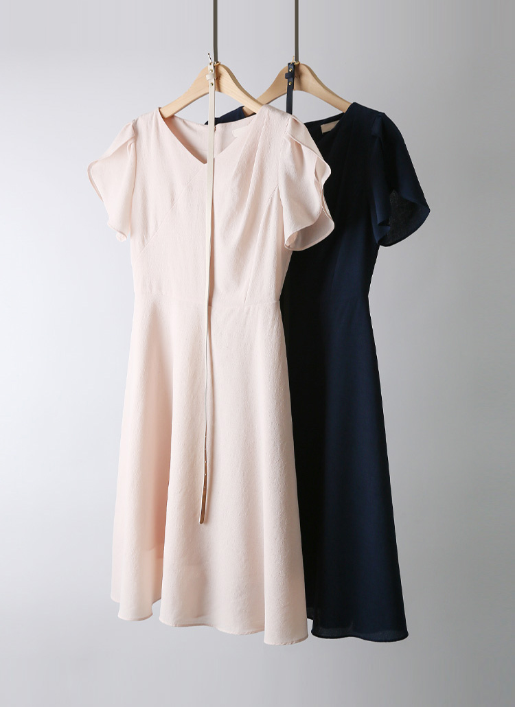 청초한 튤립 소매 벨트SET 핀턱브이넥 플레어 원피스