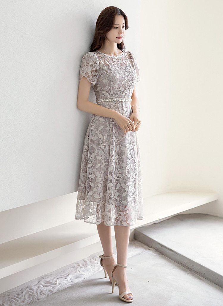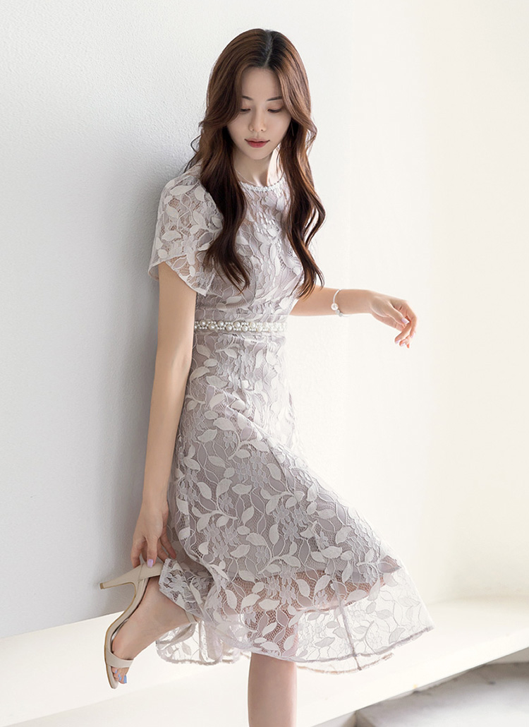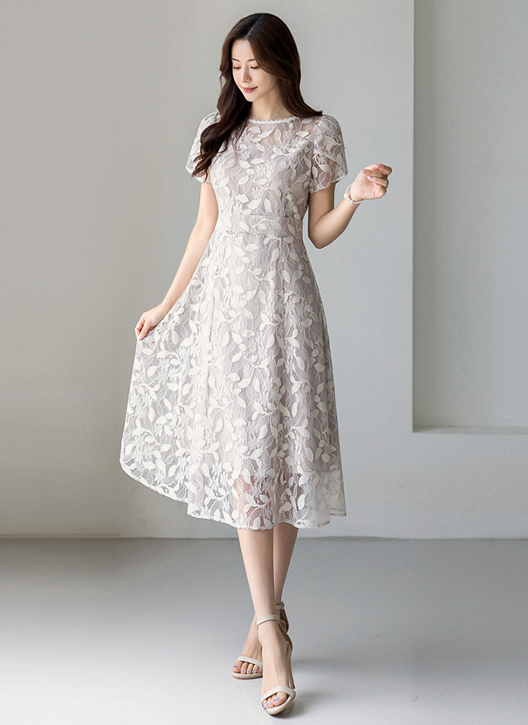 [LouisAngel] 엘린느 퍼퓸 페미닌 튤립 소매 펄 레이스 A라인 플레어 원피스