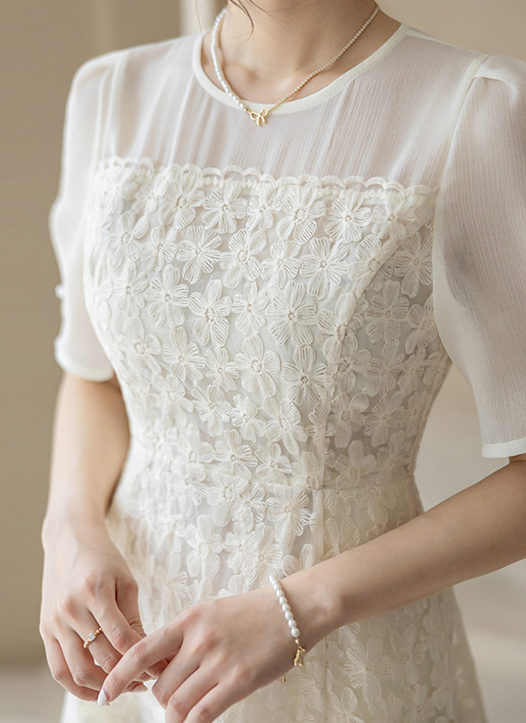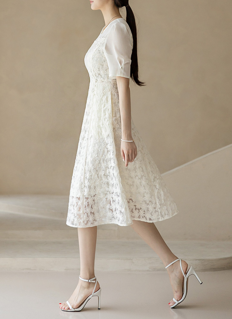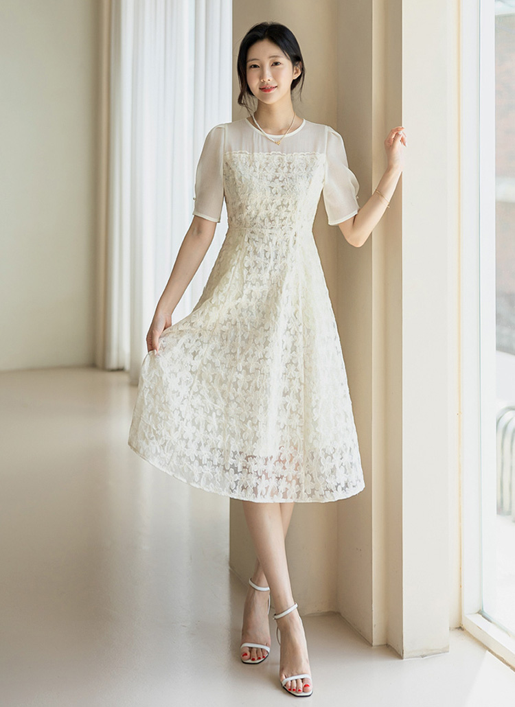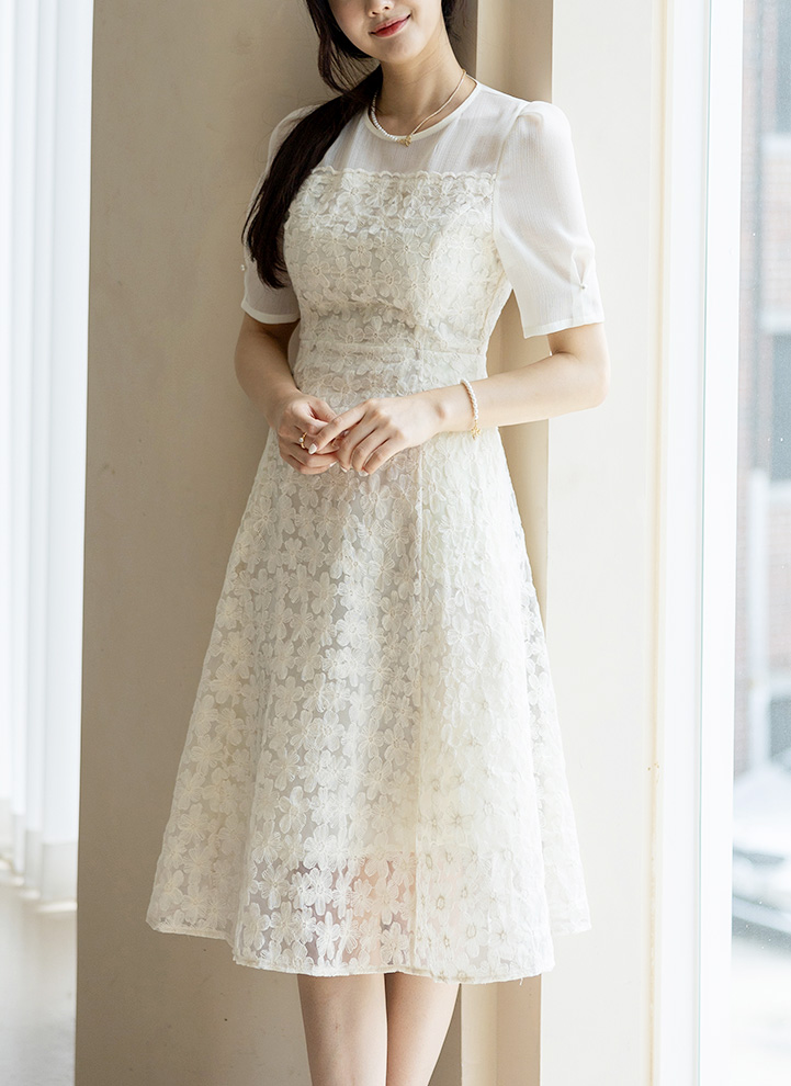 [LouisAngel] 단아플라워 자수 쟈가드 시스루 퍼프 플레어 원피스