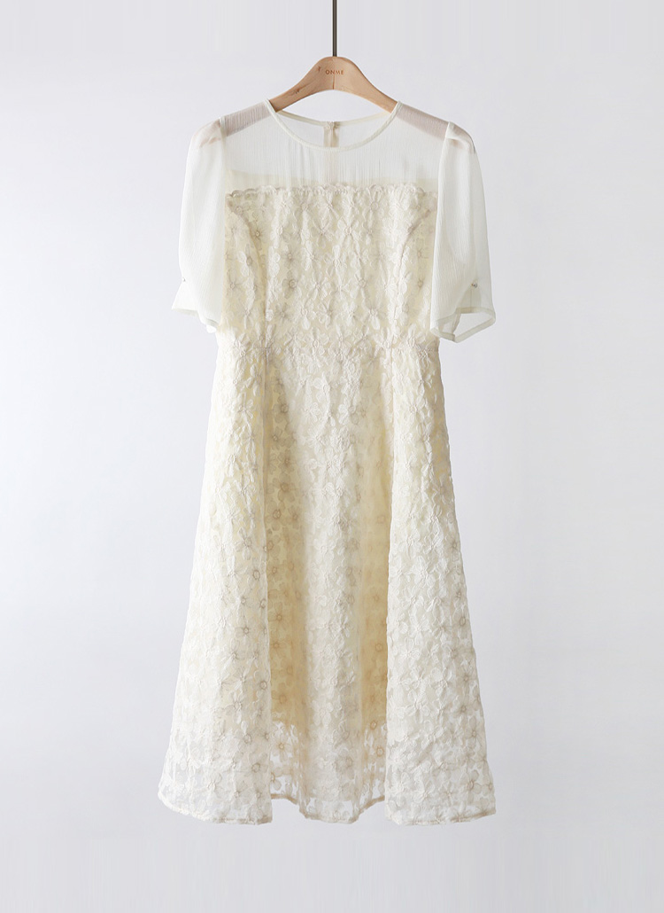 [LouisAngel] 단아플라워 자수 쟈가드 시스루 퍼프 플레어 원피스