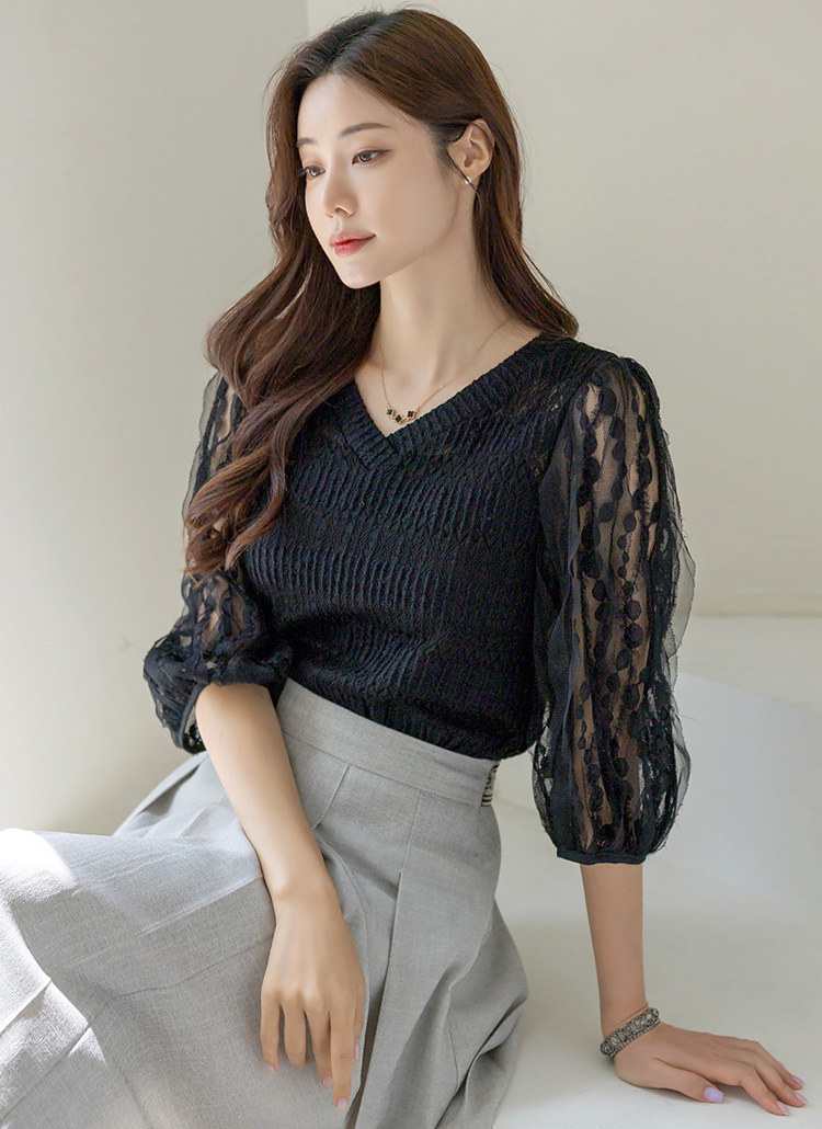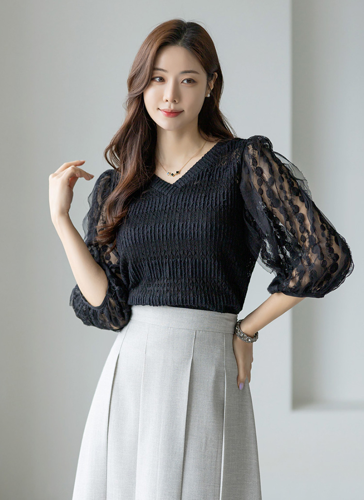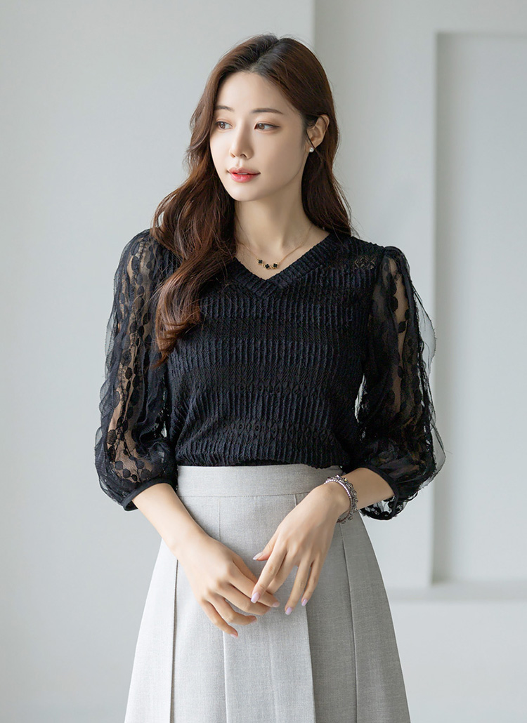 [LouisAngel] 페미닌 실루엣 시스루 쟈가드 도트 레이스 소매 배색 블라우스 티