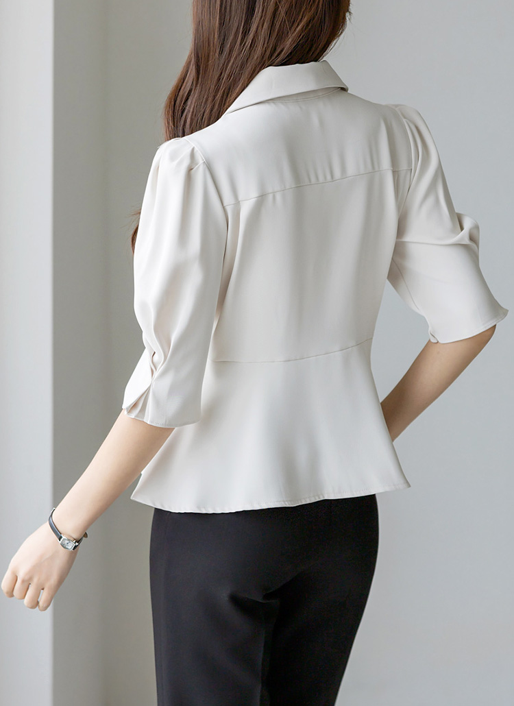 베네딕 핀턱 셔링 페플럼 라인 랩 블라우스