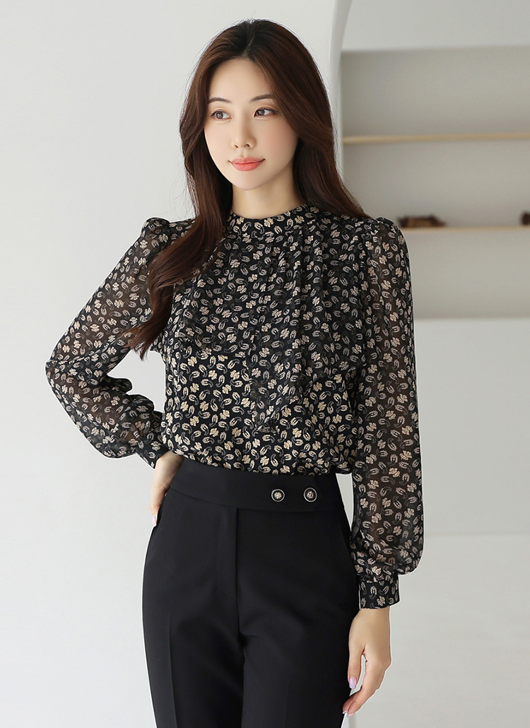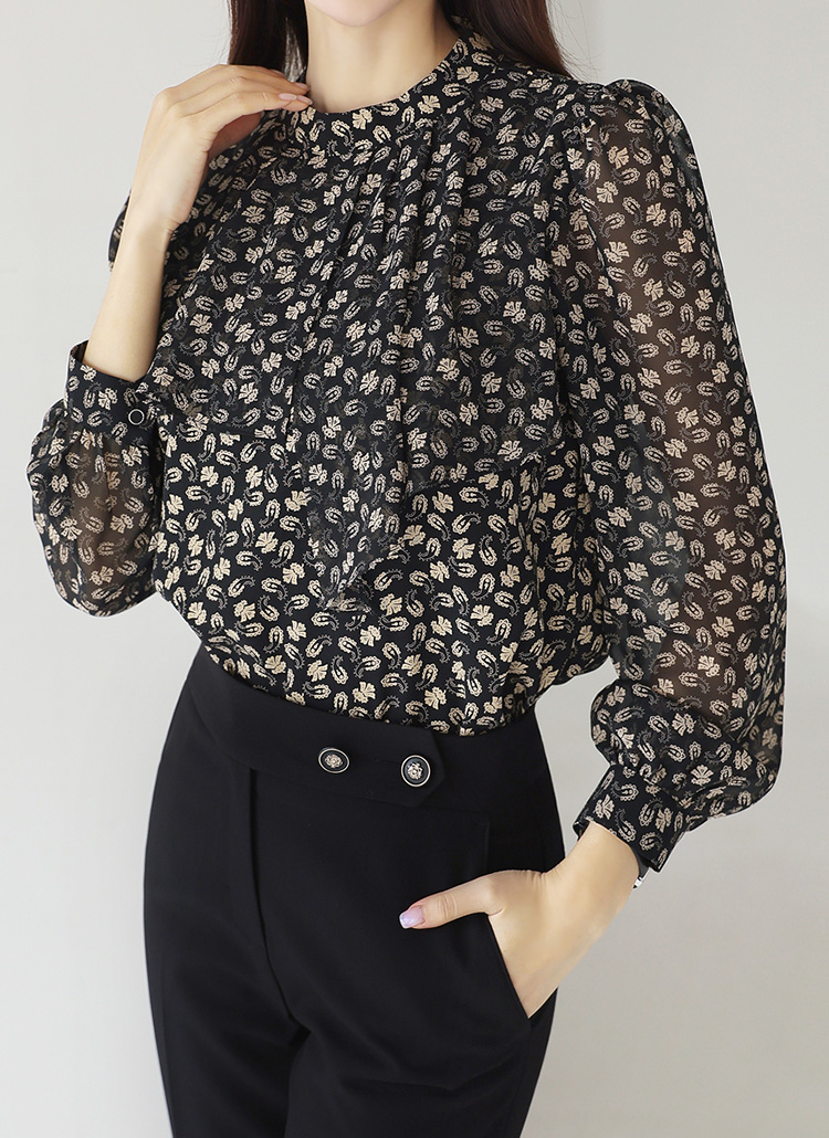 로아넬 에스닉 투톤 페이즐리 볼륨 셔링 반하이넥 블라우스