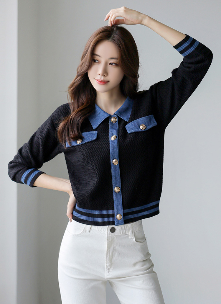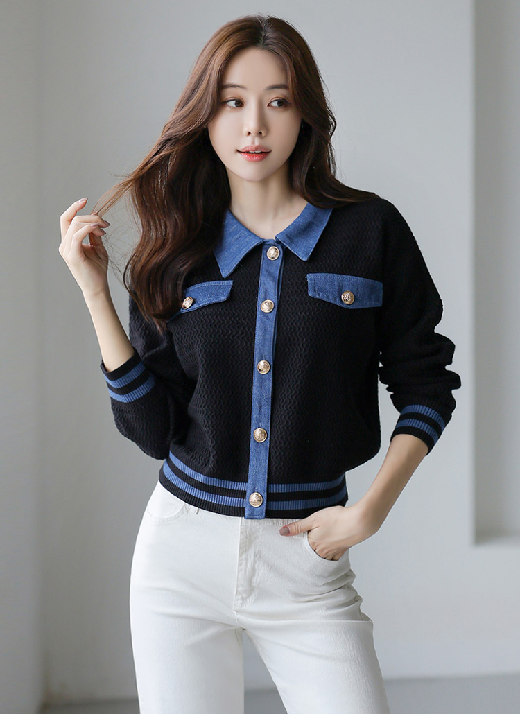 센티멘 데님 카라 배색 물결 쟈가드 니트 가디건