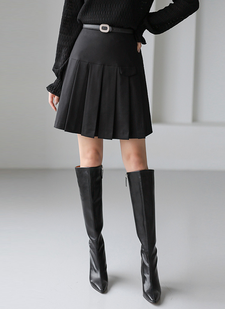 밑단의 플리츠 디테일이 돋보이며 A라인으로 퍼지는 디자인이