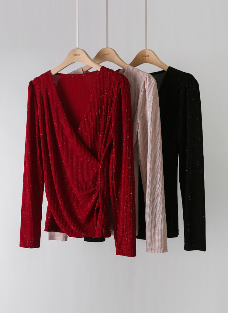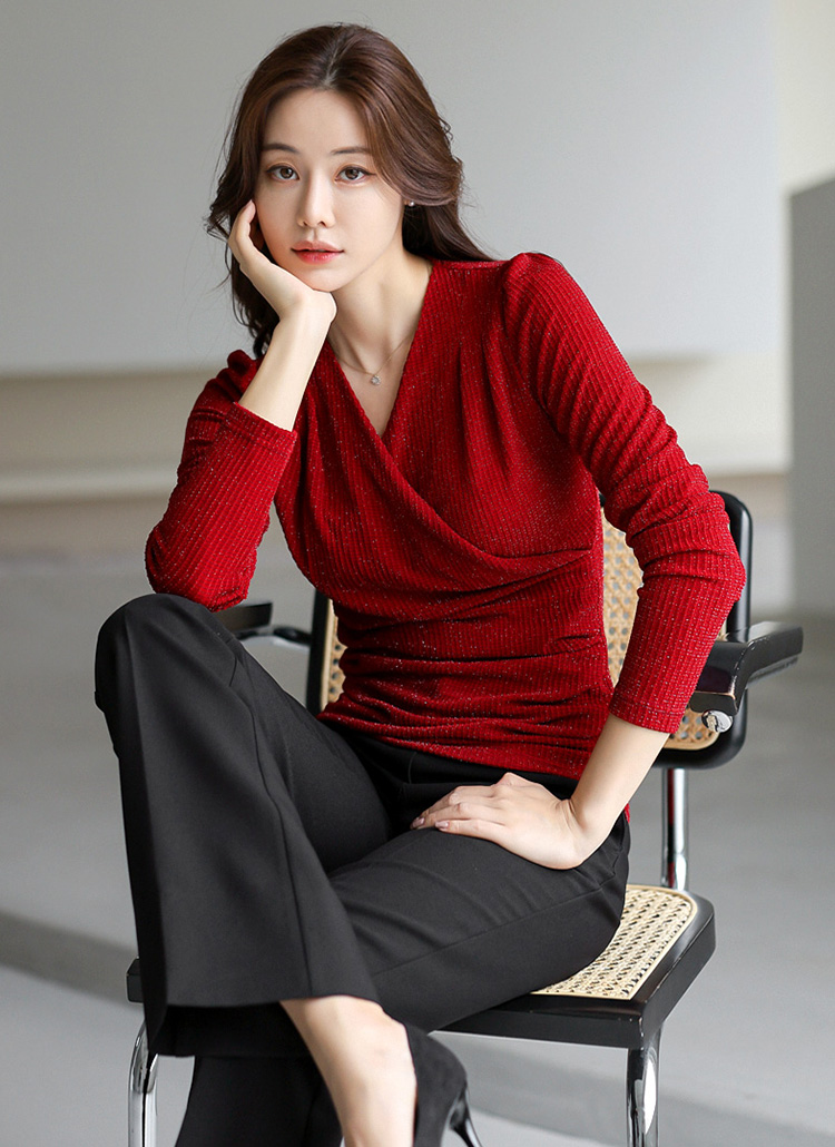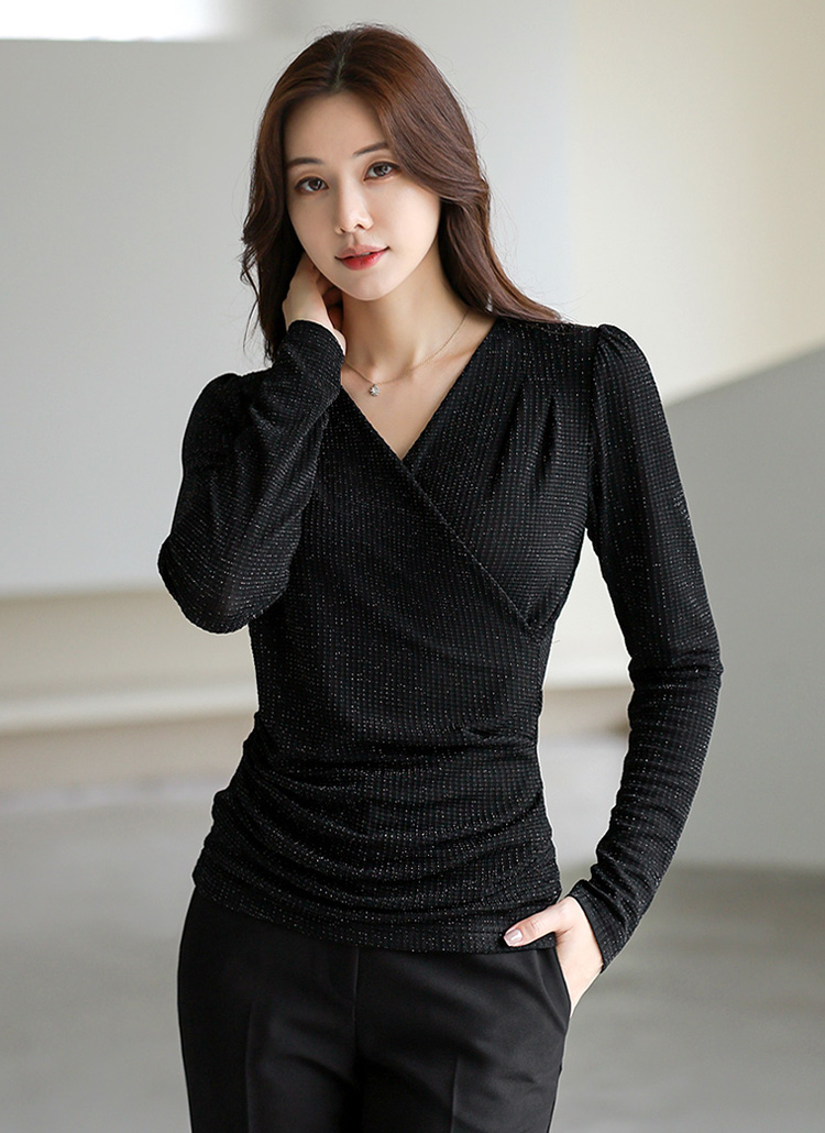 [LouisAngel] 샤인 펄 실키 텐션 볼륨 실루엣 셔링 랩 블라우스 티