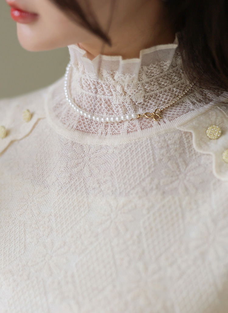 [Theonme] 퓨어스 스모킹 반하이넥 플라워 레이스 쟈가드 니트 블라우스