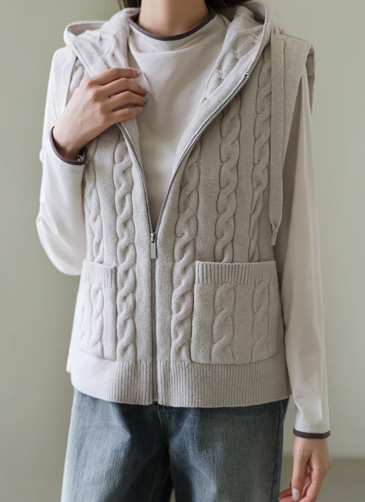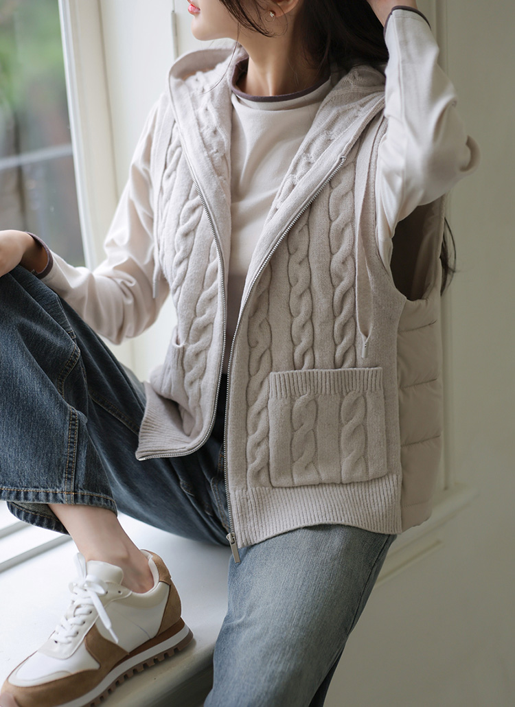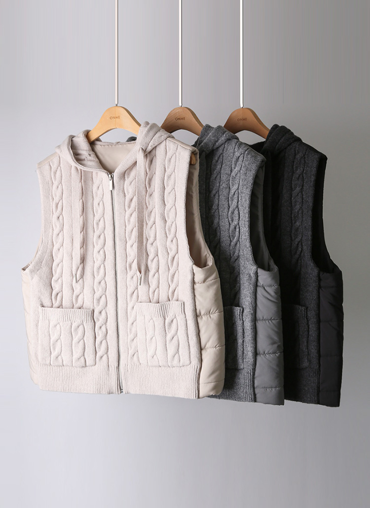 [Theonme] 헤리즈 하프 배색 꽈배기 니트 경량 패딩 후드 집업 조끼 베스트