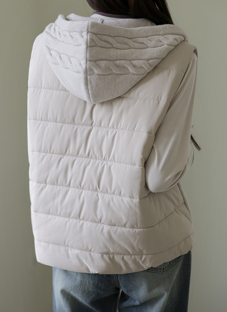 [Theonme] 헤리즈 하프 배색 꽈배기 니트 경량 패딩 후드 집업 조끼 베스트