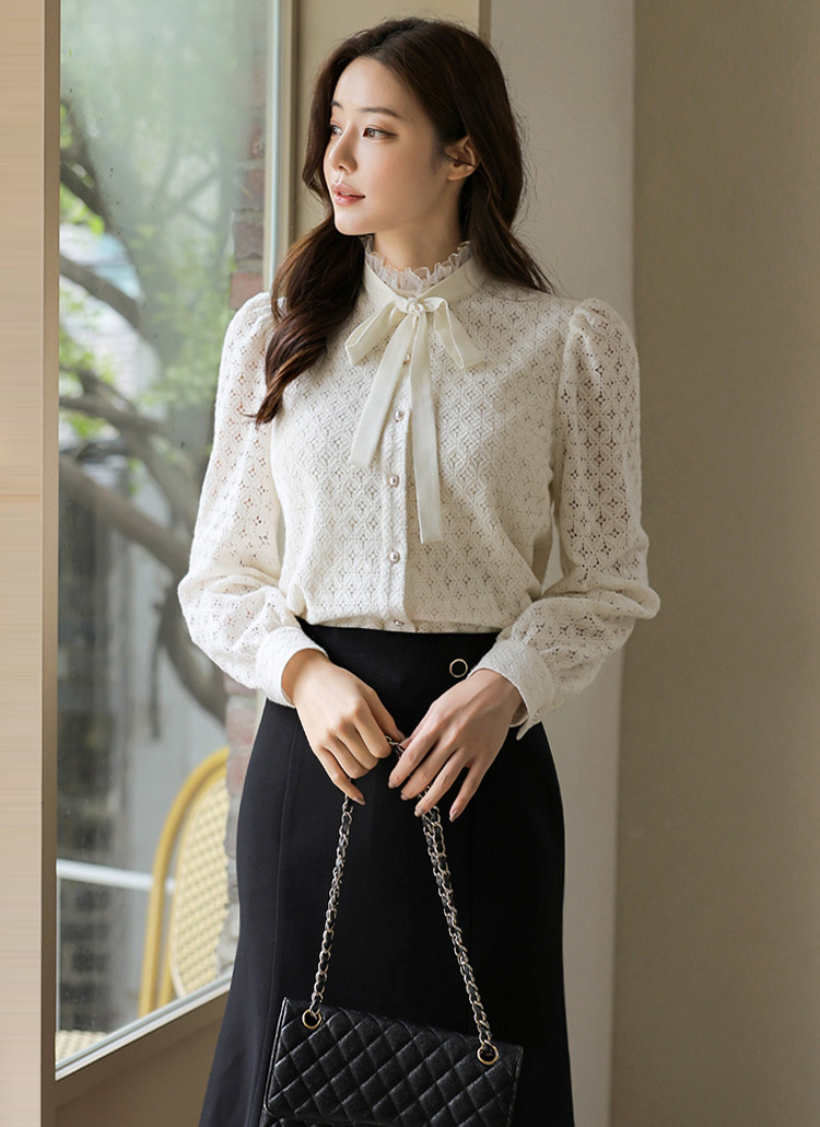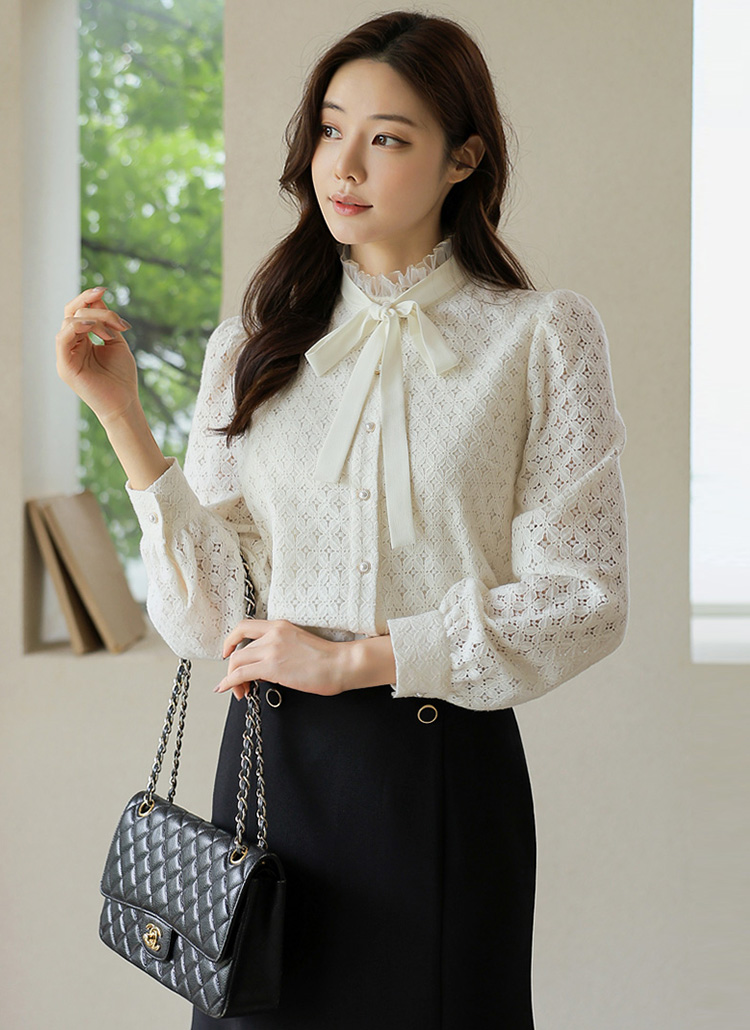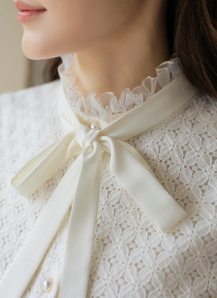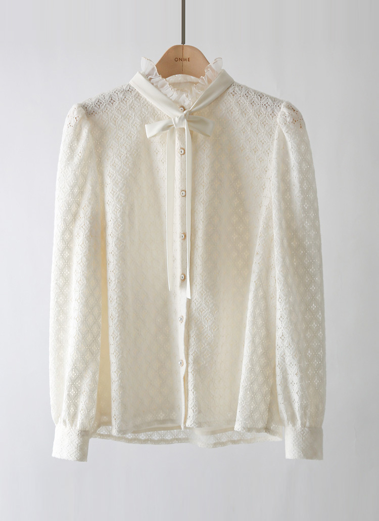 [LouisAngel] 포근 플라워 레이스 타이SET 시스루 프릴넥 블라우스
