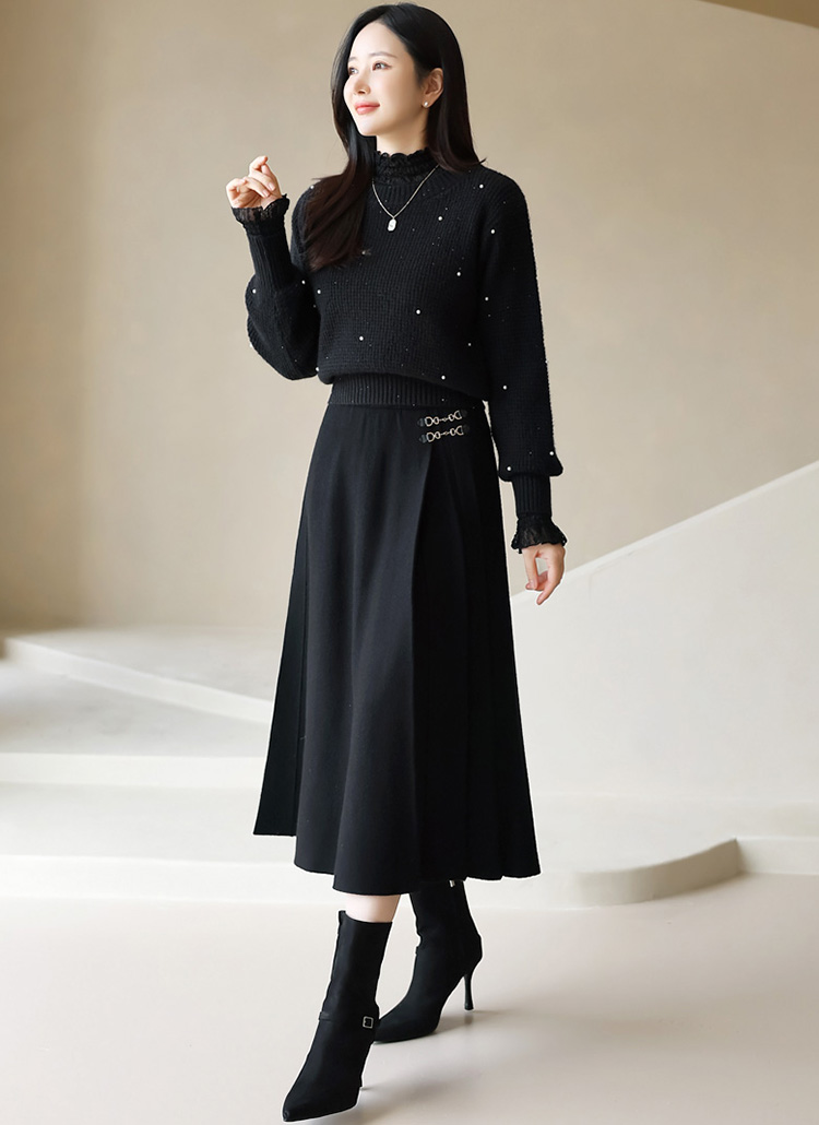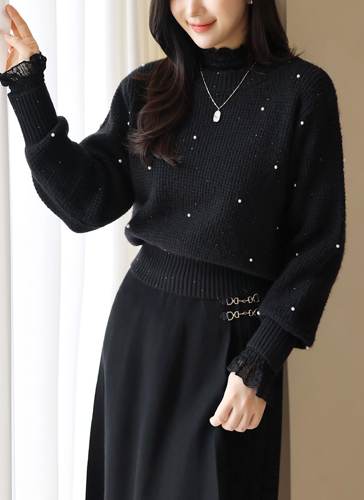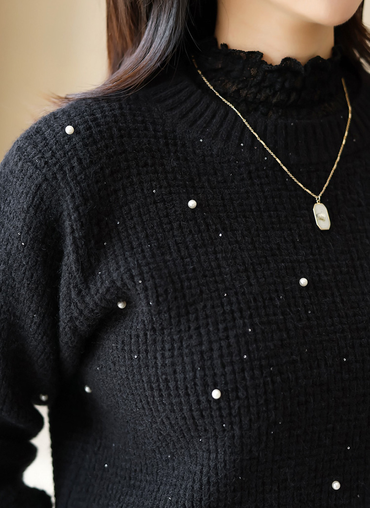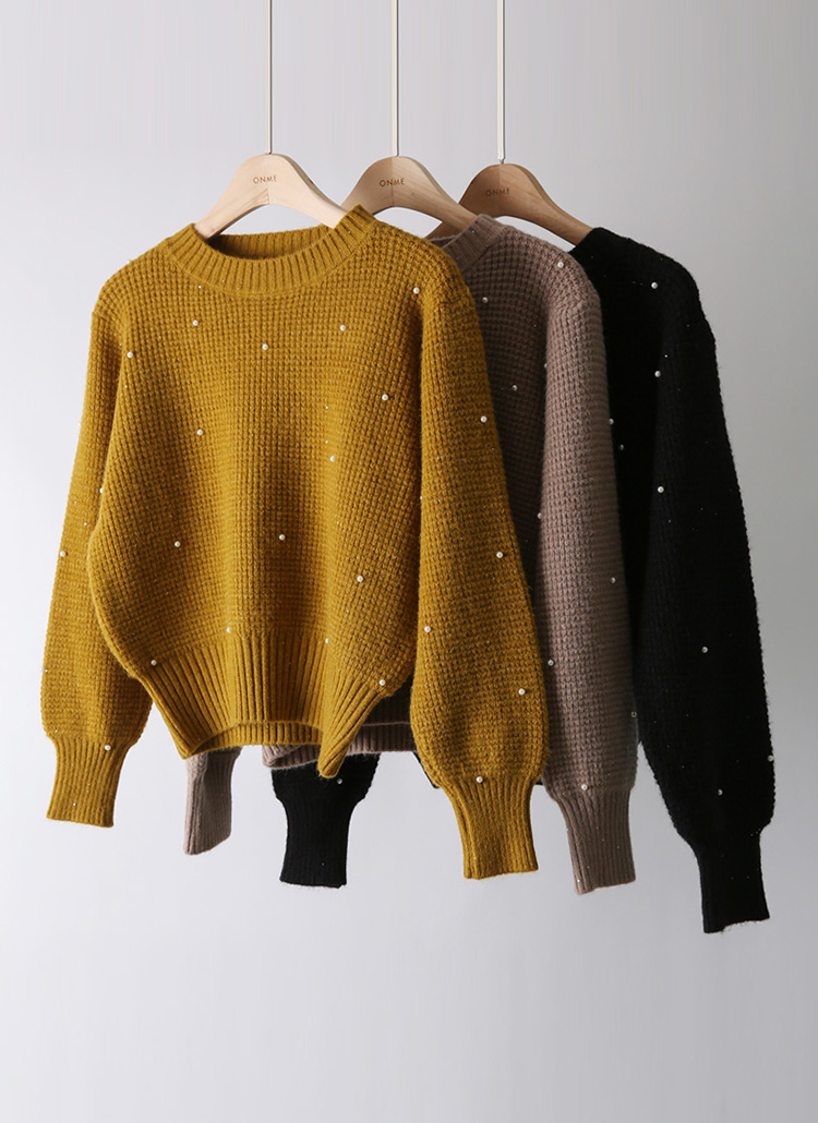 화사한 진주 스팽글 믹스 밑단 시보리 포근 라운드 니트