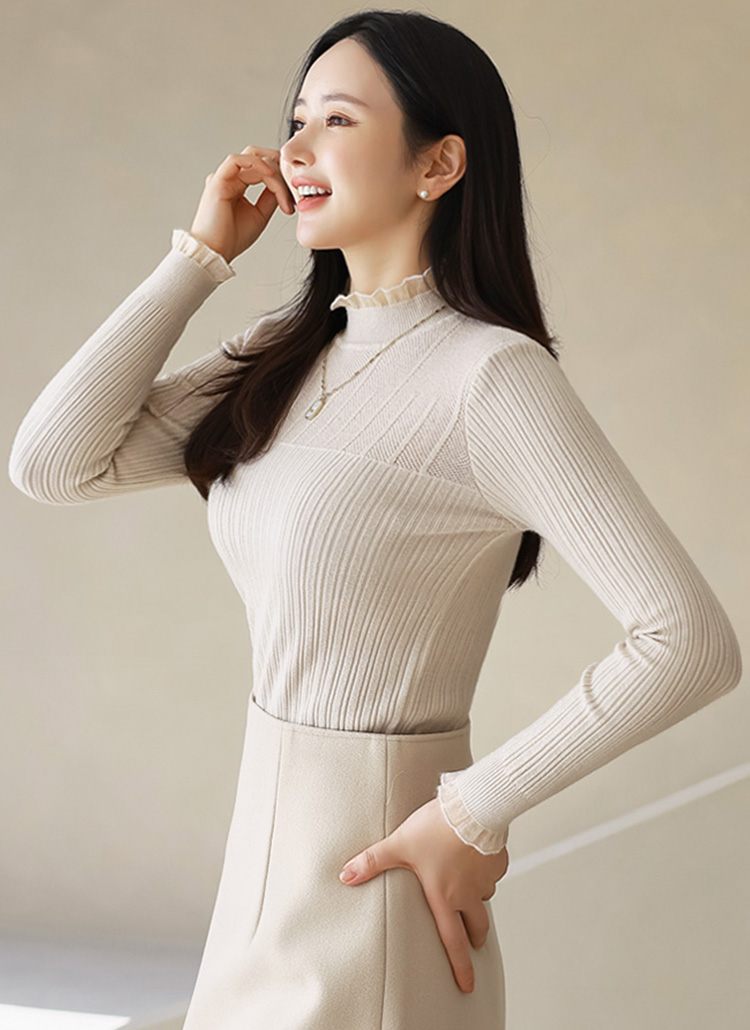 시스루 프릴 배색이 사랑스러움을 더하는 골지 반하이넥 니트에요 :)