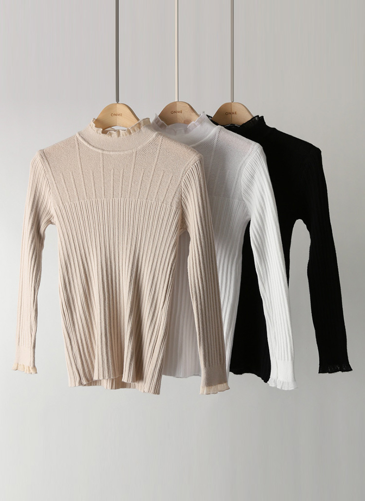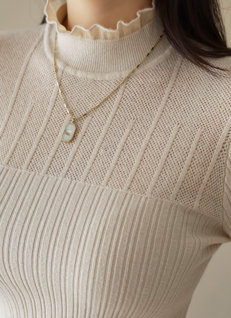 네티아 시스루 배색 프릴 라인 골지 반하이넥 니트