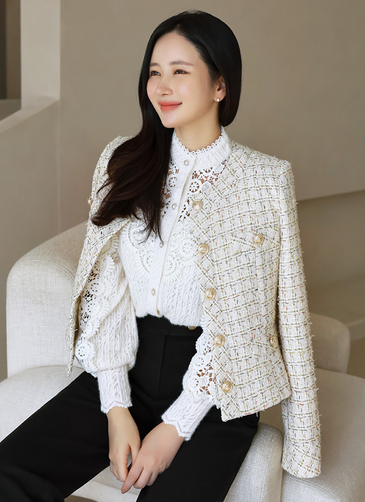소매와 넥라인의 스캘럽 라인이 여성스러운 실루엣을 강조해줍니다~