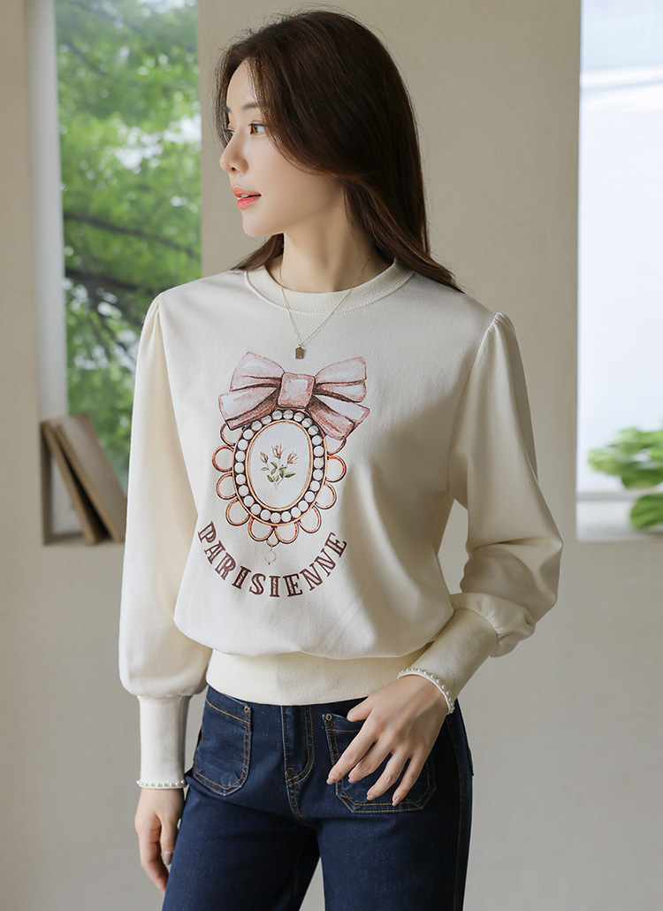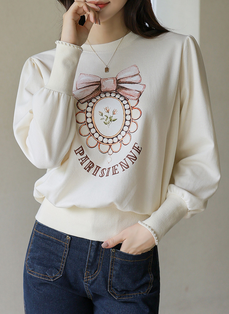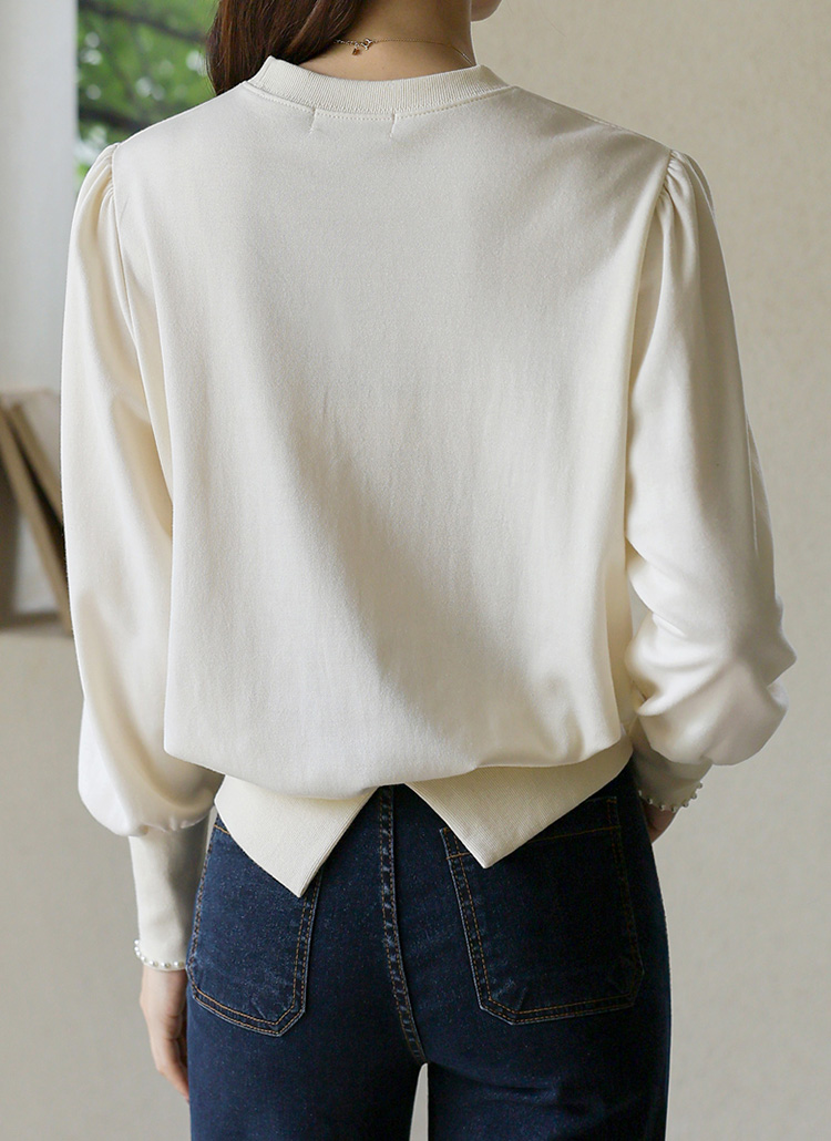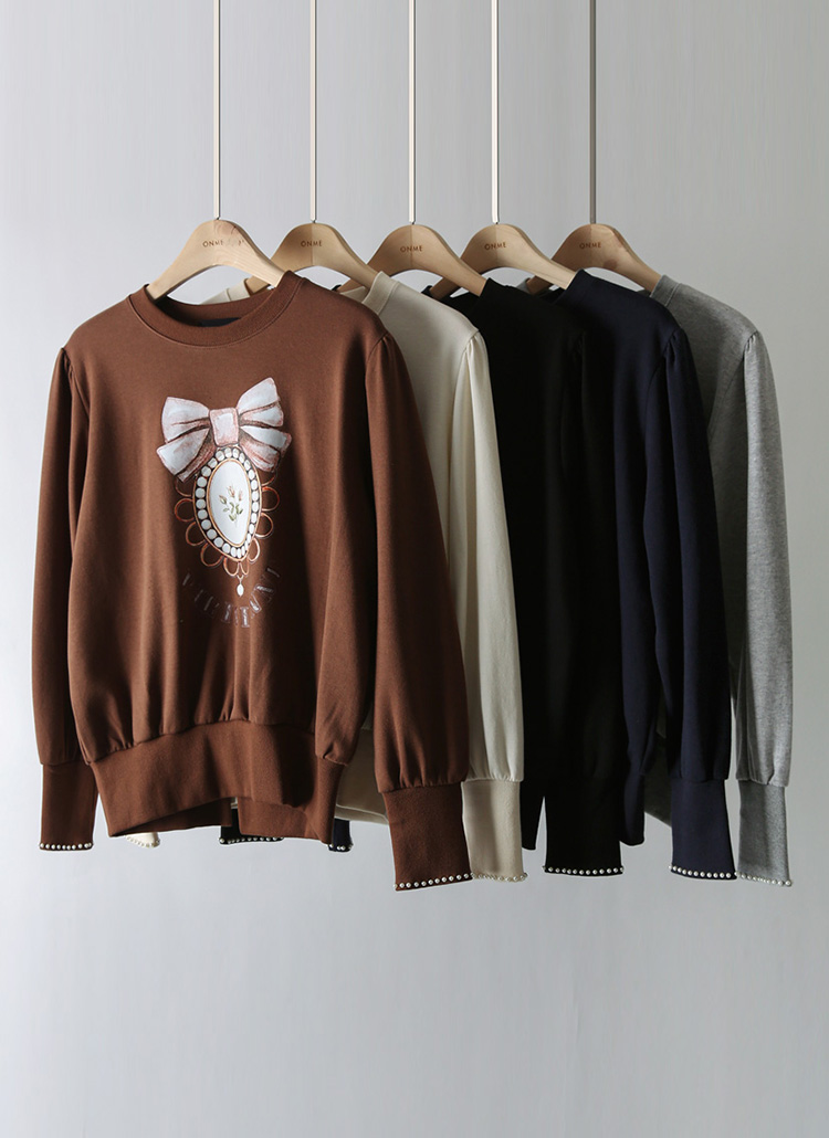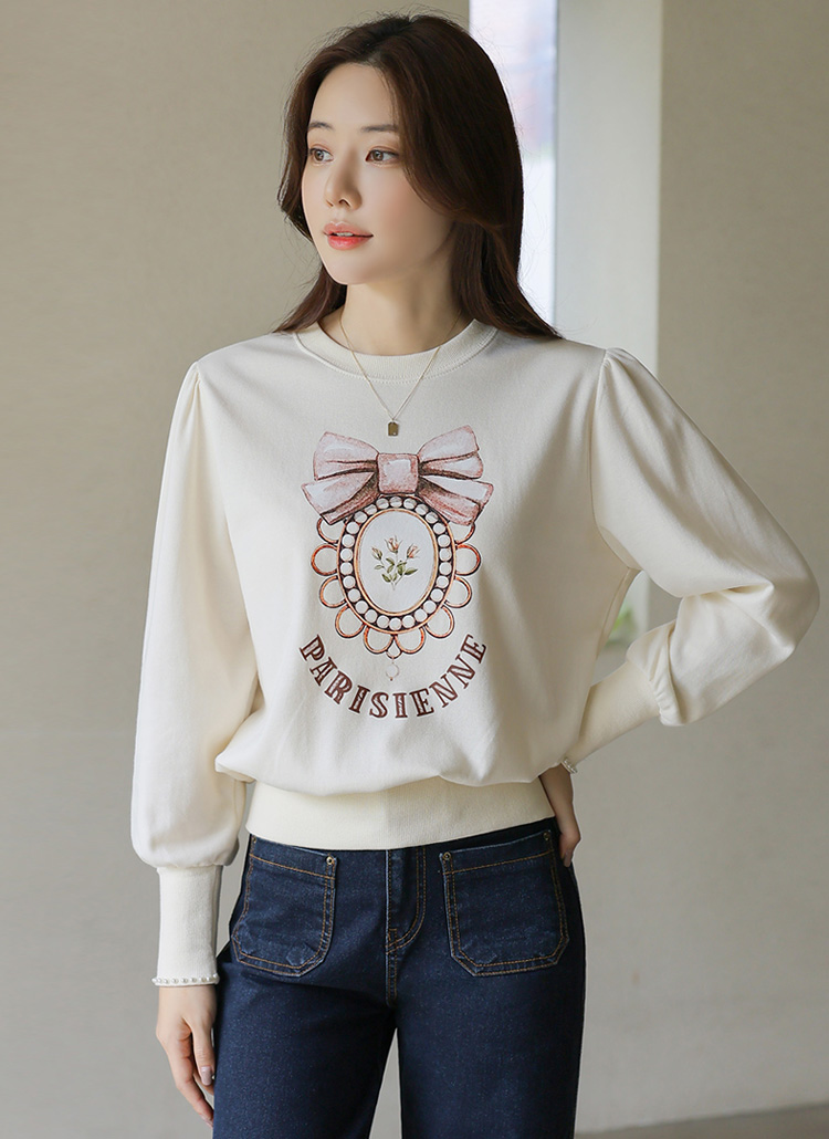 진주 퍼프소매 뒷트임 시보리 프린팅 맨투맨