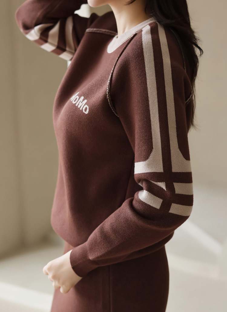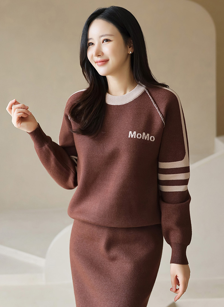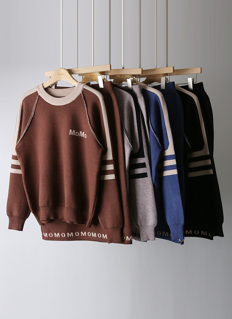 모모닝 라인 포인트 디테일 라운드 니트 스커트 세트