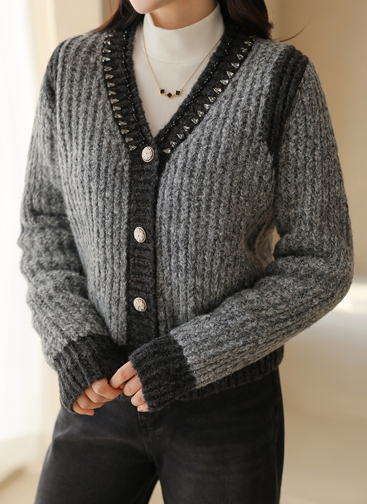 큐빅 브이넥 울 도톰 배색라인 니트 가디건