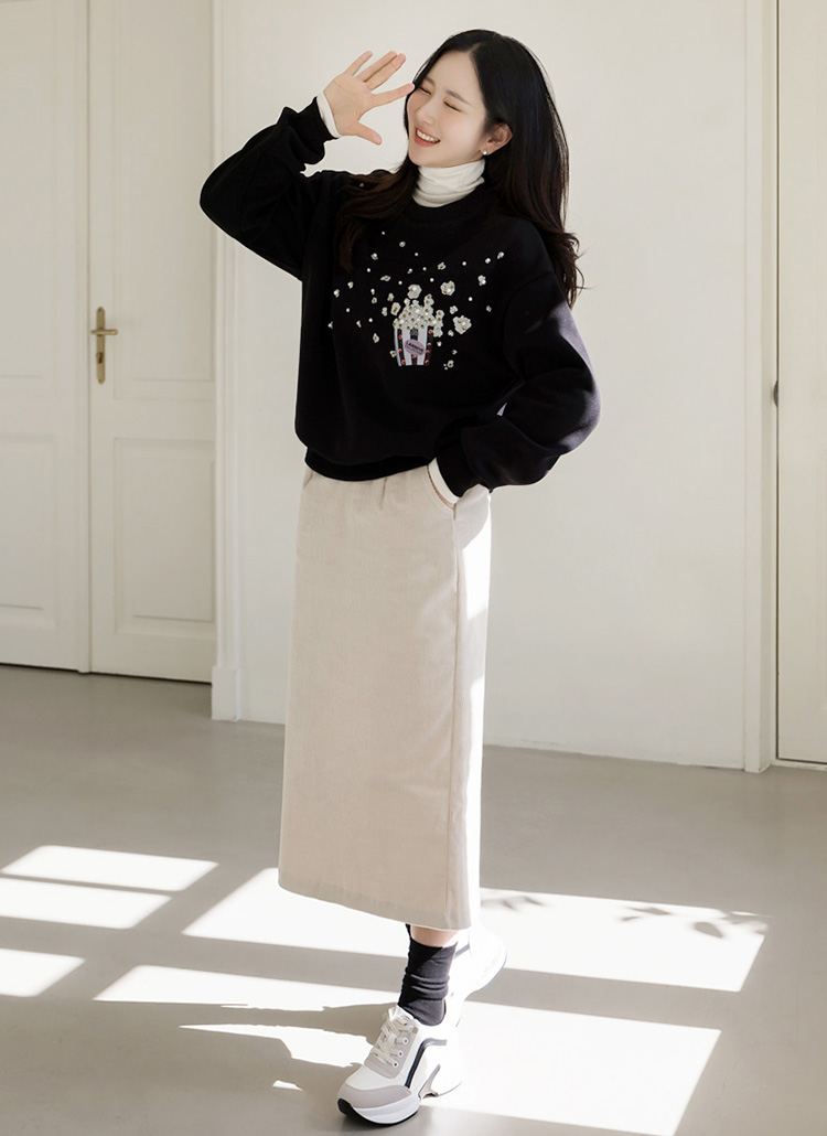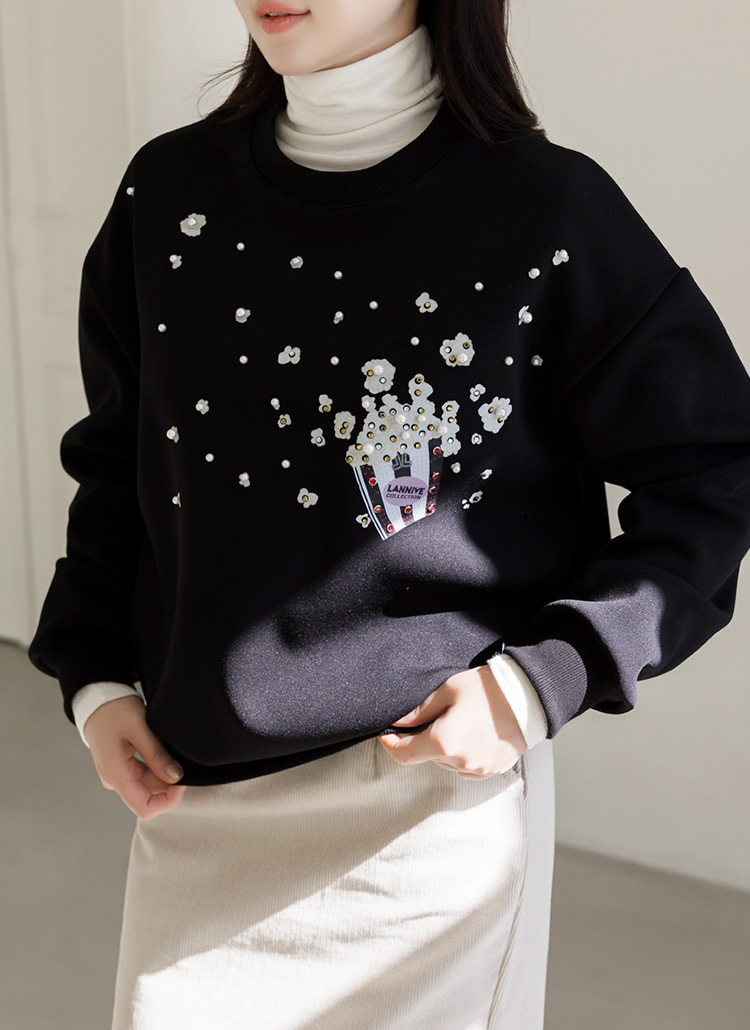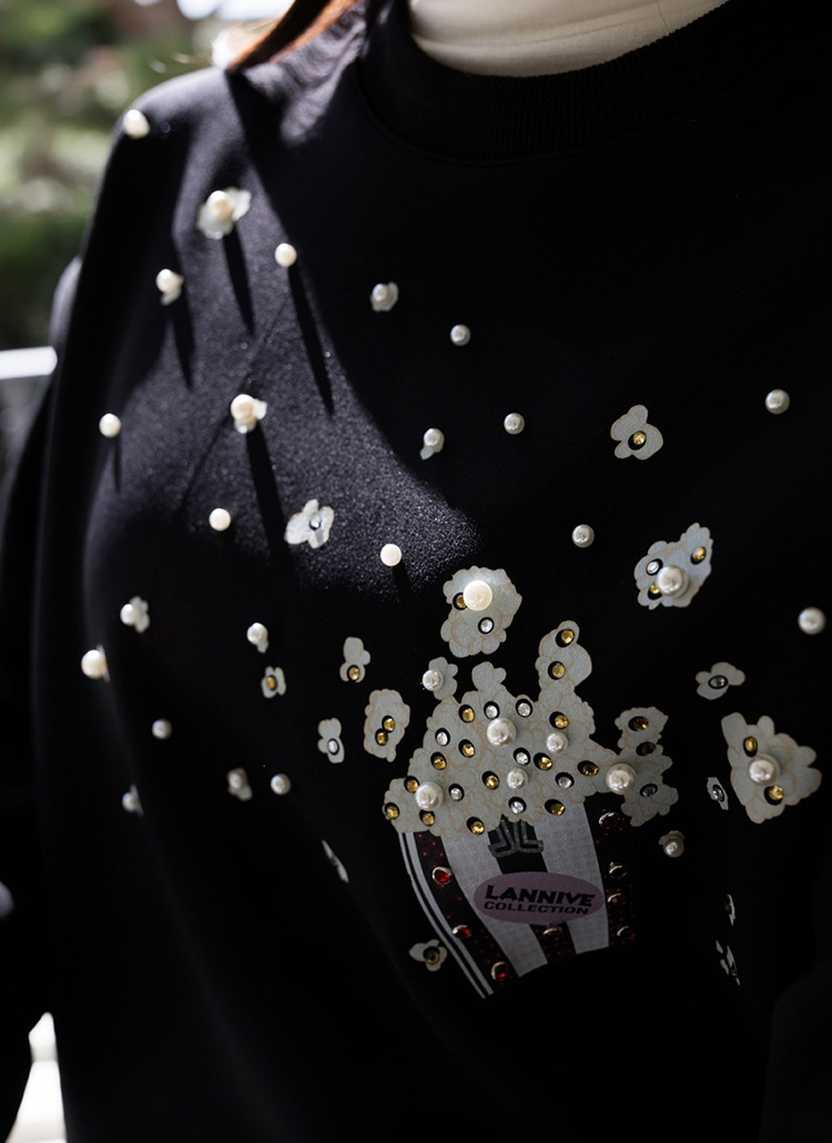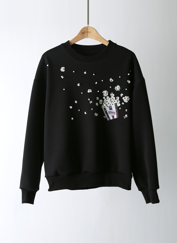 팝아트적으로 연출된 팝콘 프린팅에 진주 비즈 장식을 더해
