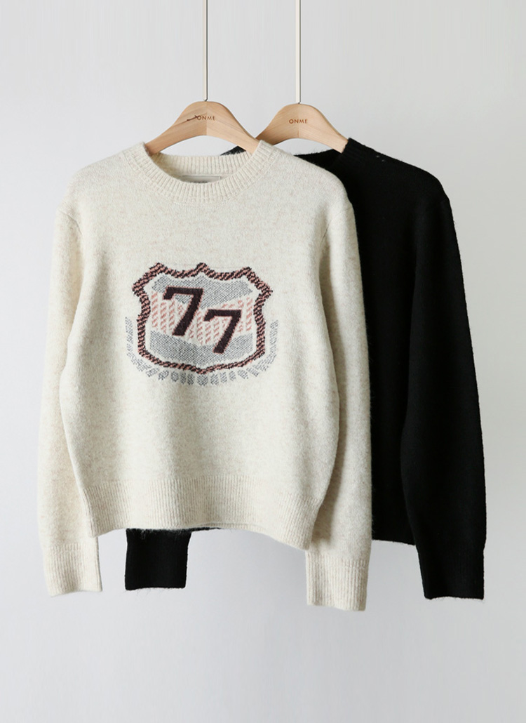 럭키 세븐 자수 프린팅 울블렌딩 보카시 라운드 니트