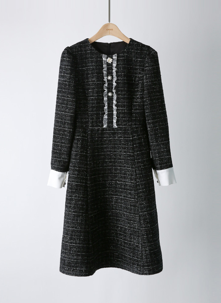 [LouisAngel] 쥬디스 미니 쉬폰 프릴 배색 진주 버튼 트위드 A라인 플레어 원피스
