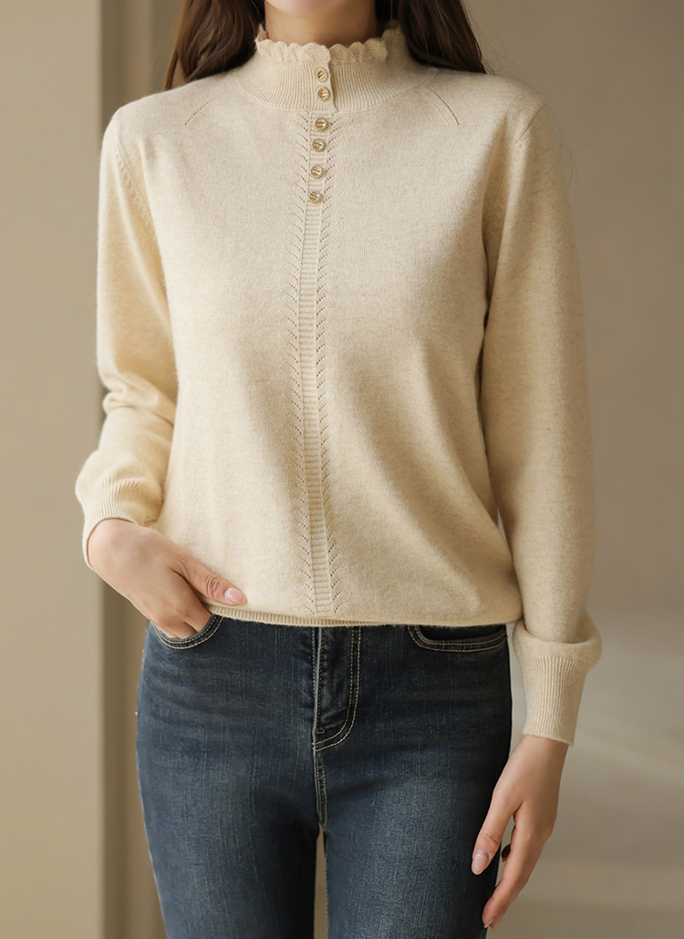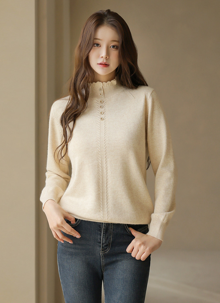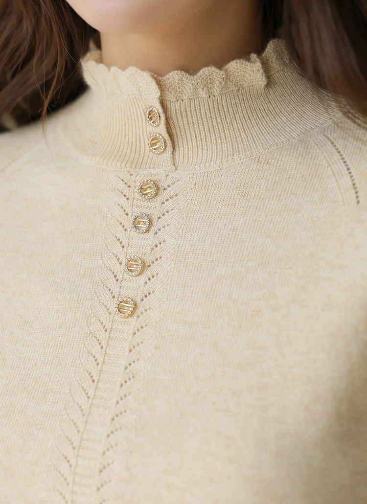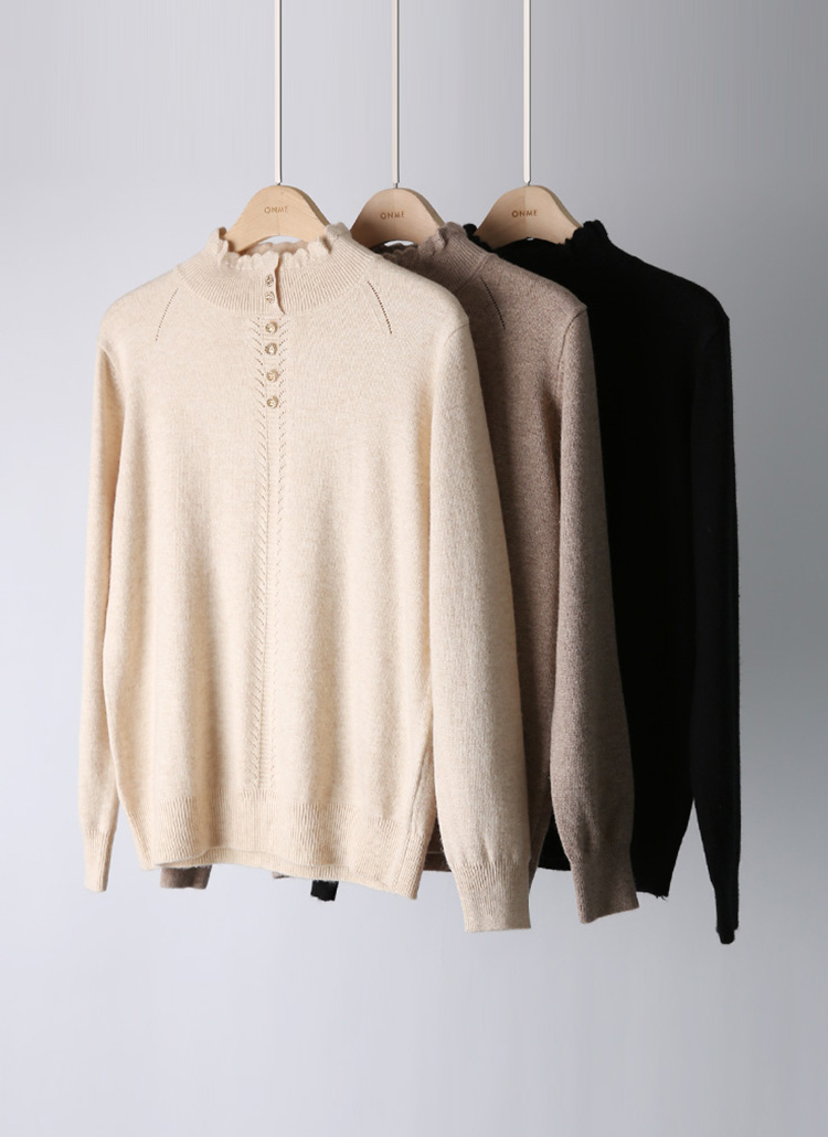 리피 미니 버튼 울 블렌딩 보카시 프릴 반하이넥 니트