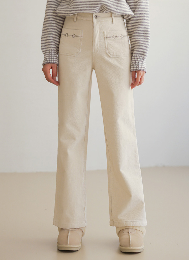 자수 체인 디테일 아웃포켓 백밴딩 속 기모 일자 코듀로이 팬츠