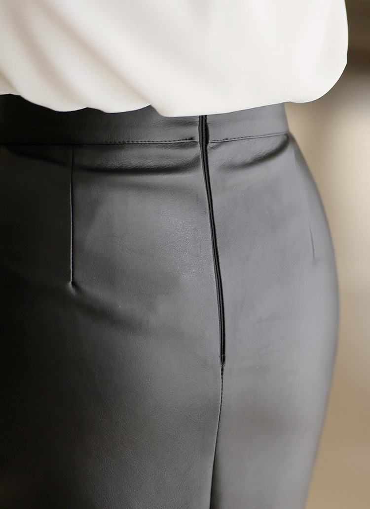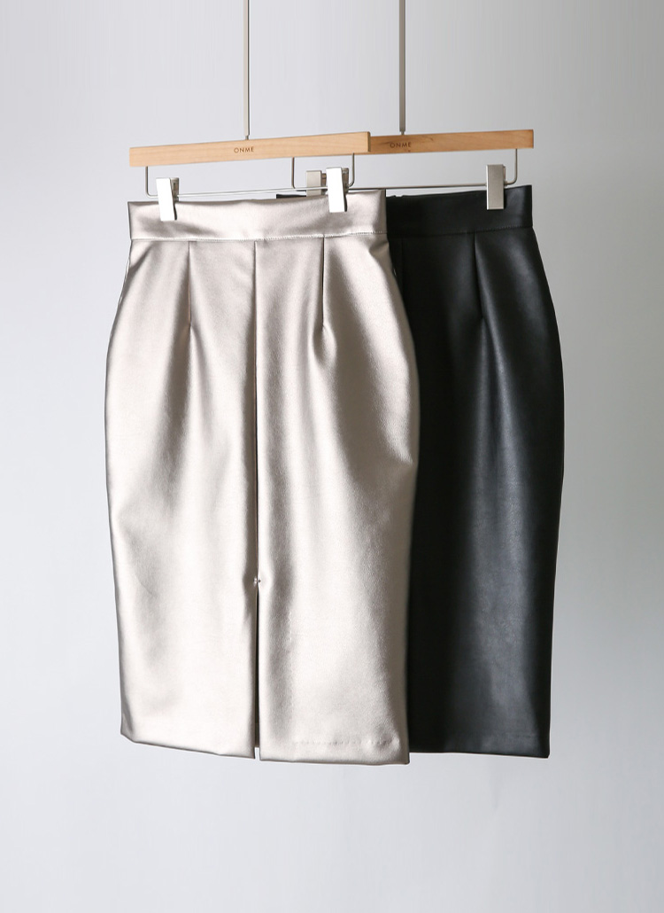 글로시 에코 레더 슬림 H라인 펜슬 미디 스커트