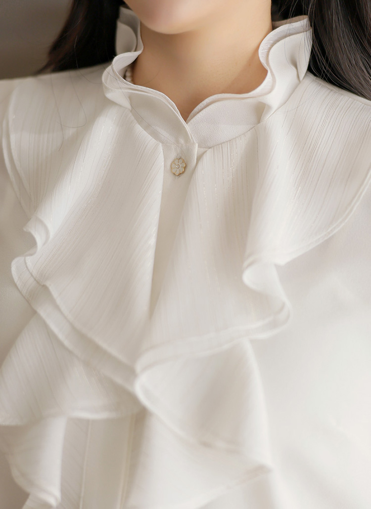 하이넥에 이중 프릴 디테일이 목선을 여리여리하게 연출해주며
