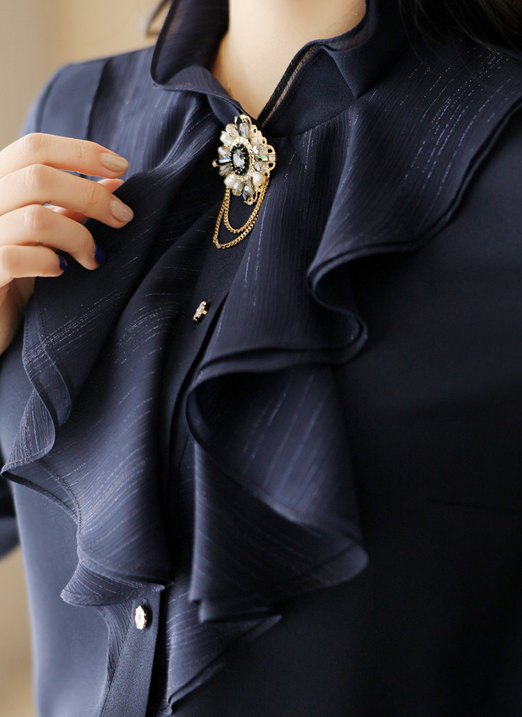 펄이 섞인 쉬폰 소재를 레이어드하여 연출한 이중 러플 디테일이