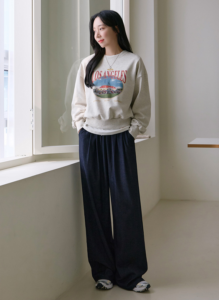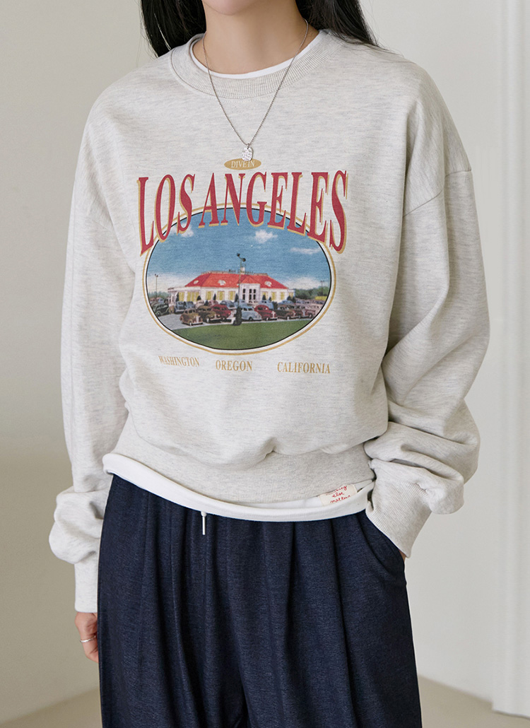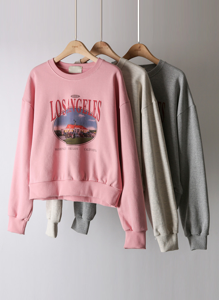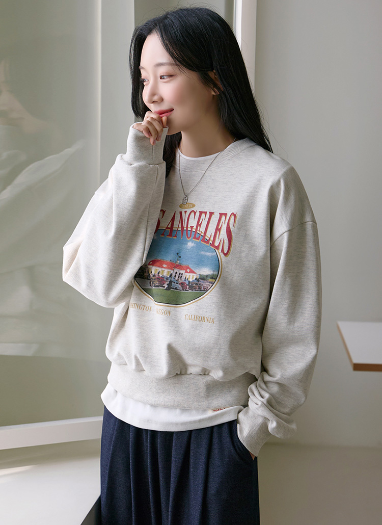 감성적인 프린팅이 돋보이는 라운드 맨투맨으로