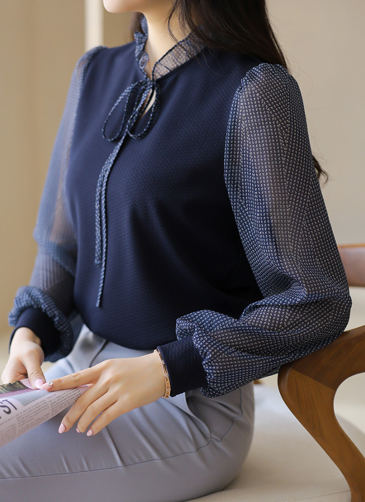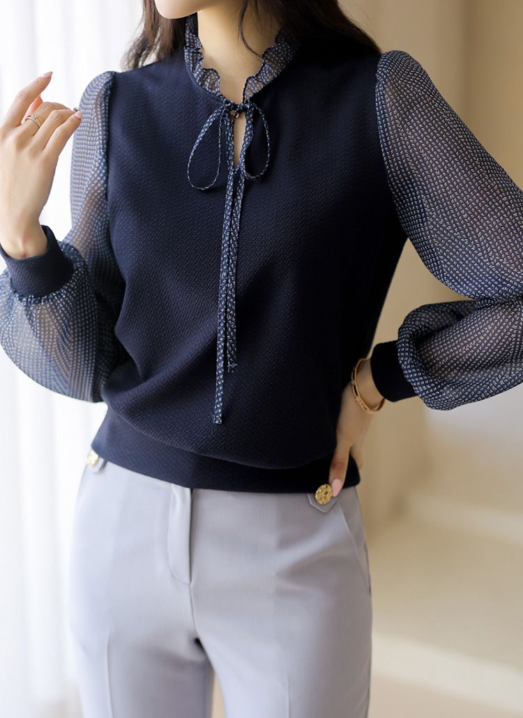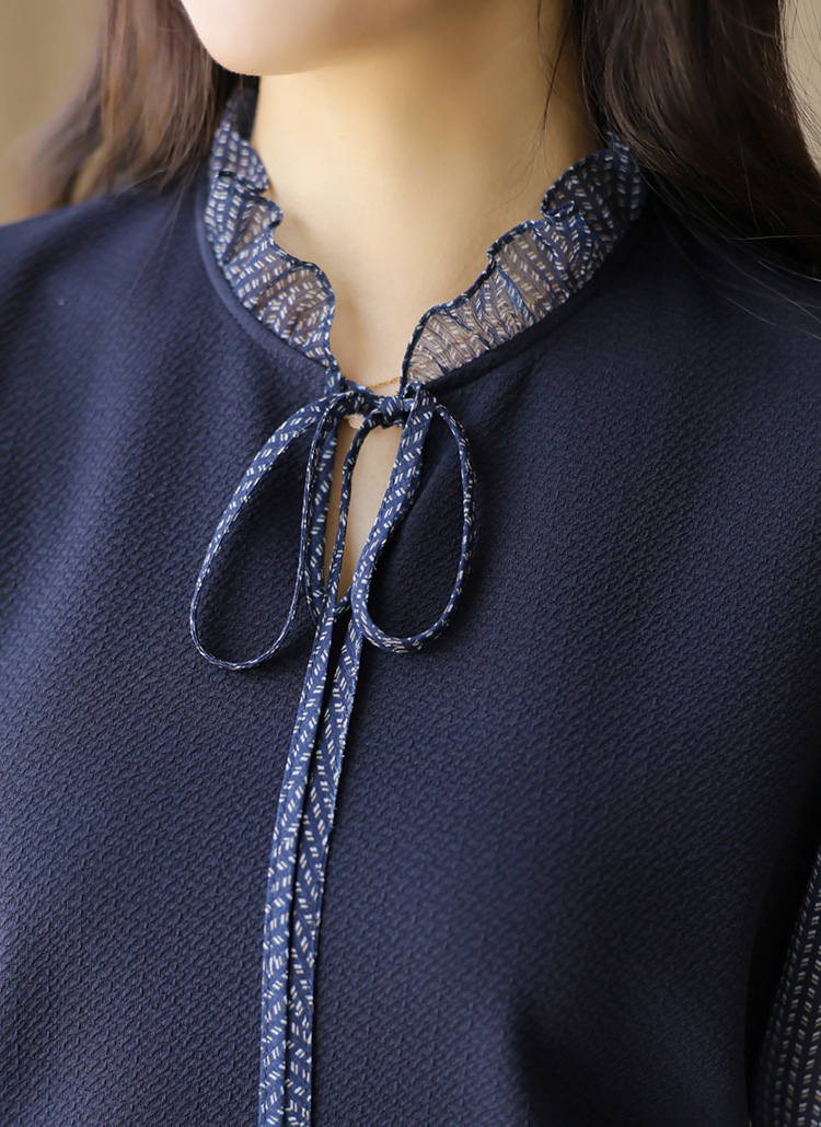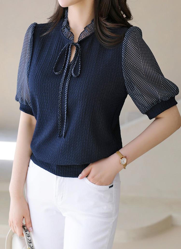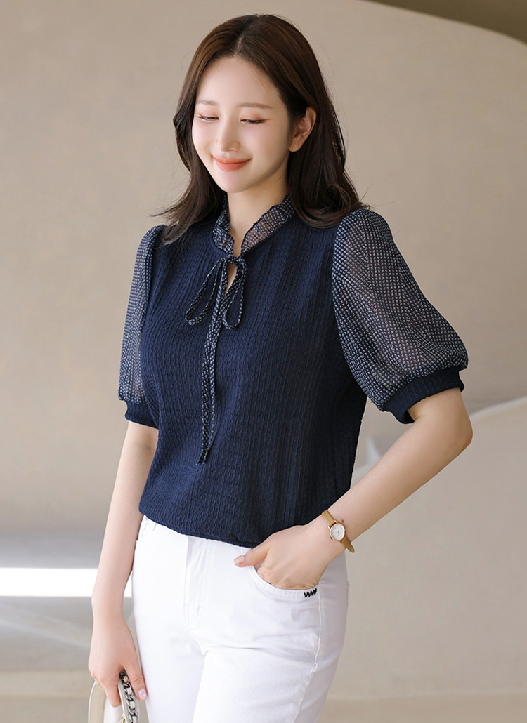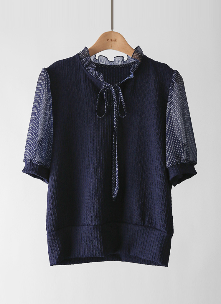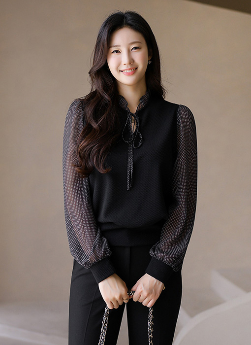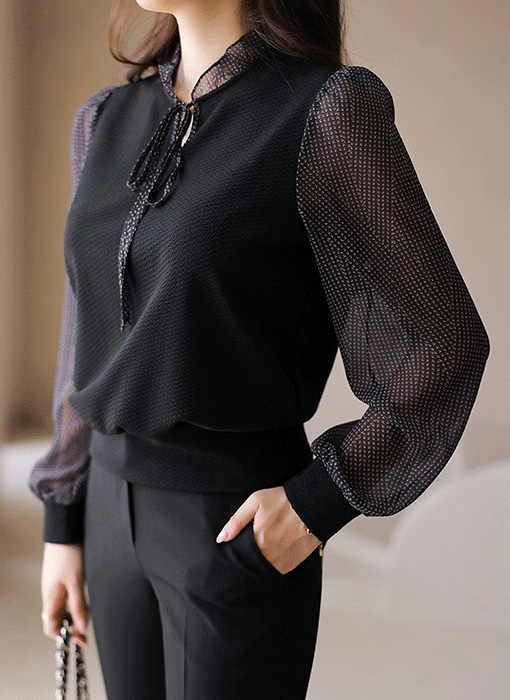 [LouisAngel] 루이델 쉬폰 소매 배색 쟈가드 블라우스 티