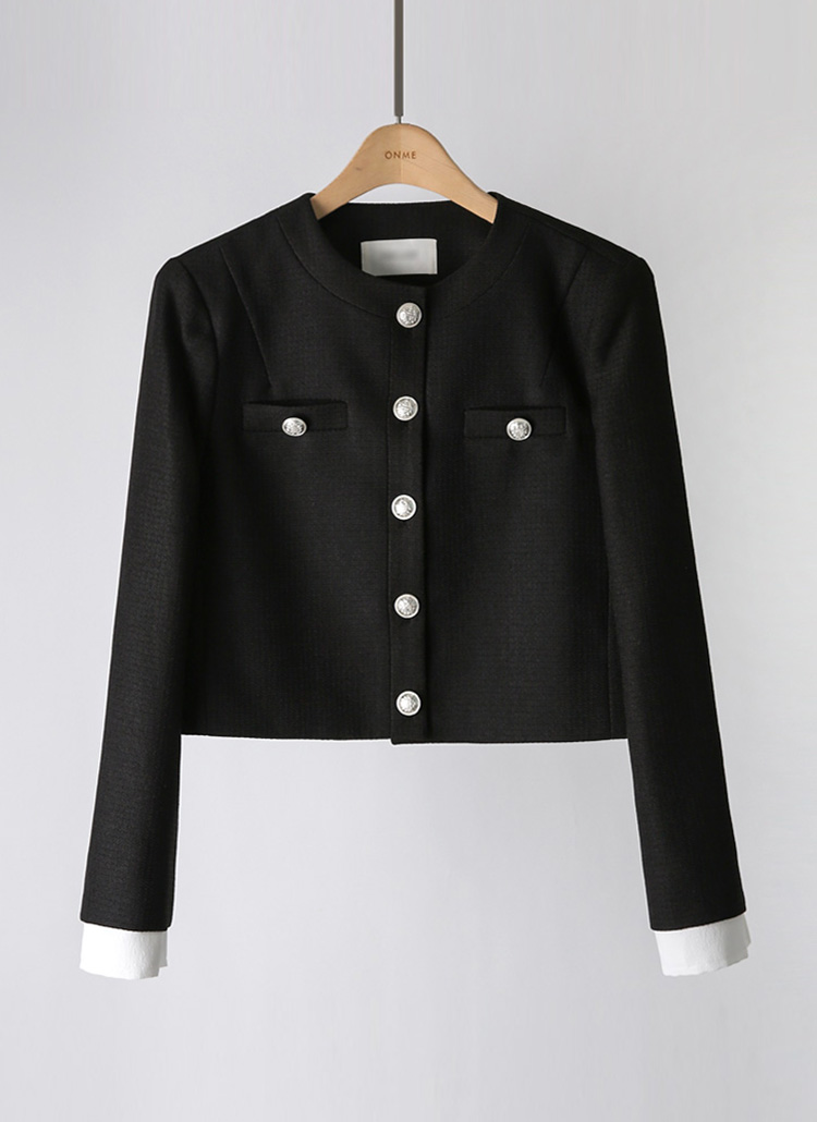 밀란 커프스SET 실버 버튼 노카라 싱글 트위드 크롭 자켓