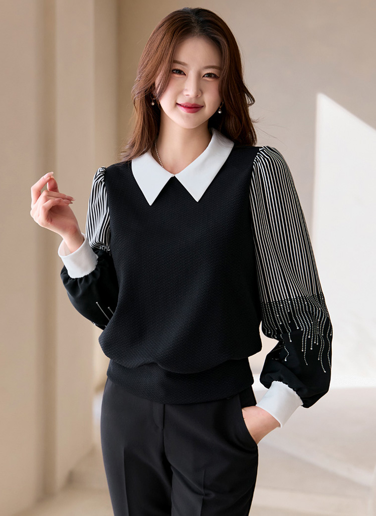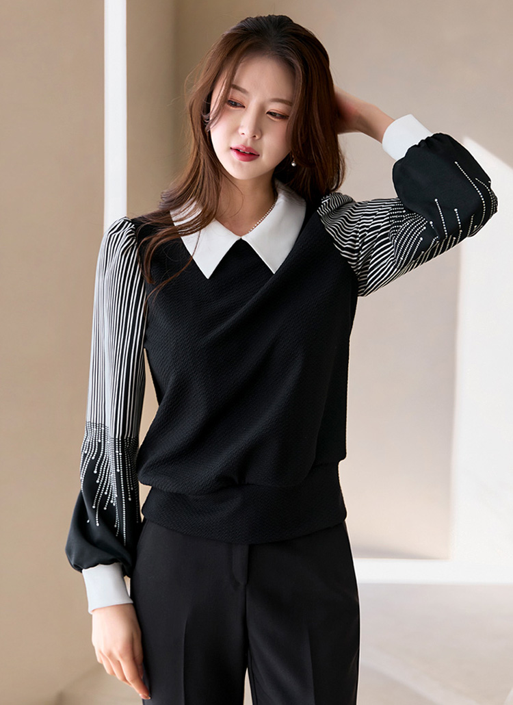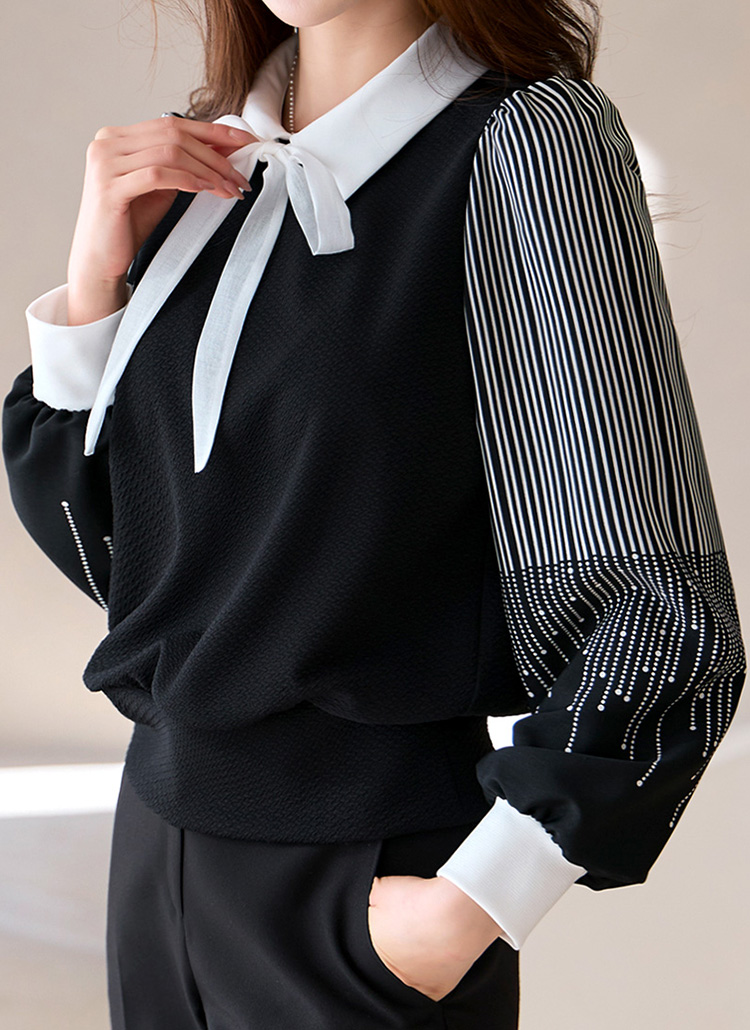 [LouisAngel] 르네 리본SET 폴링 스타 소매 배색 쟈가드 블라우스 티
