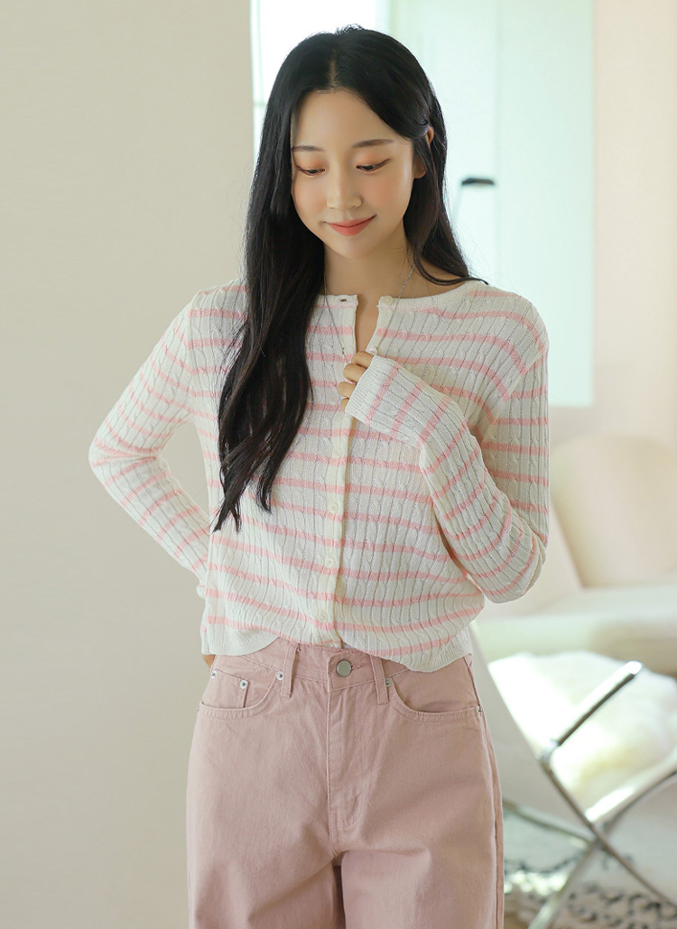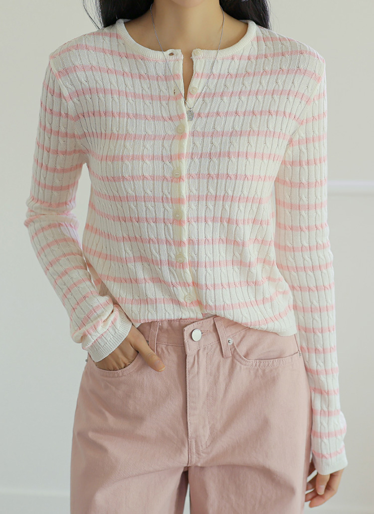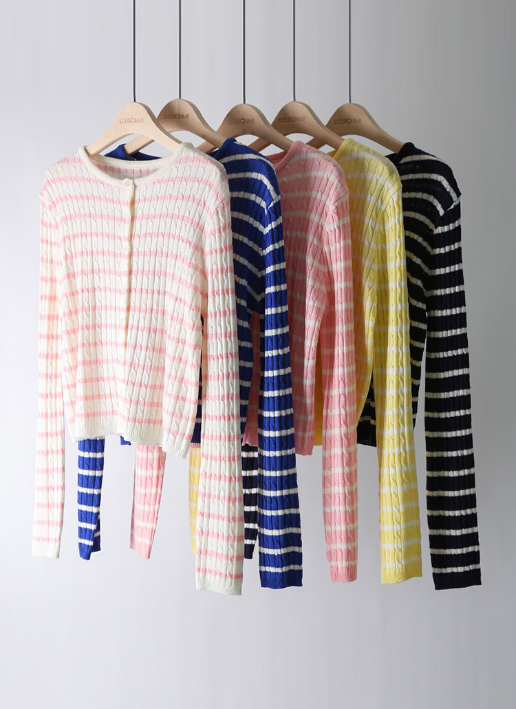 [Theonme] 레오 배색 스트라이프 캐시미어 꽈배기 가디건